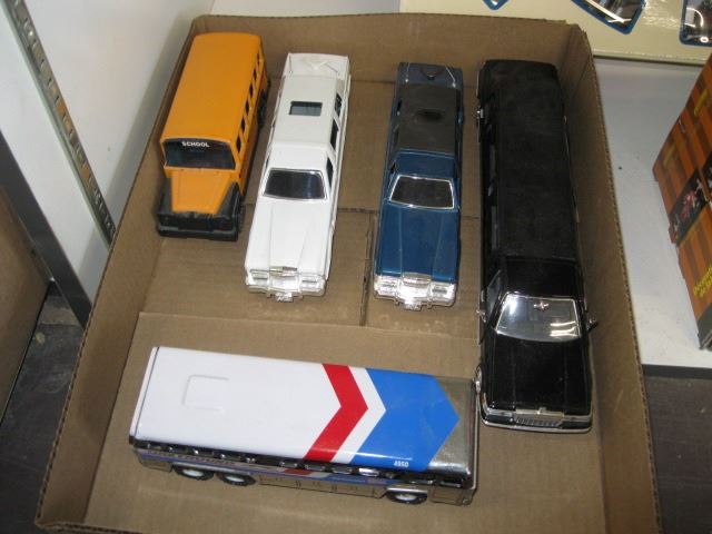 Box with 3 Limosines, School Bus, Greyhound Bus