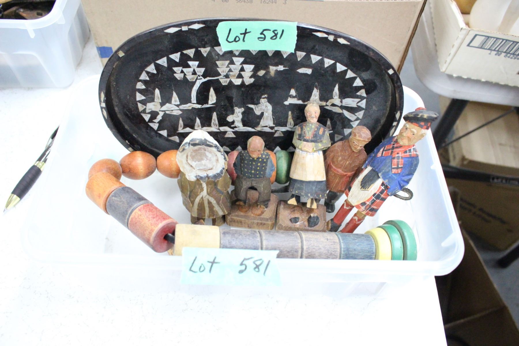 Box with Hand Carved Wooden Items & a Wooden Tray with Inlays
