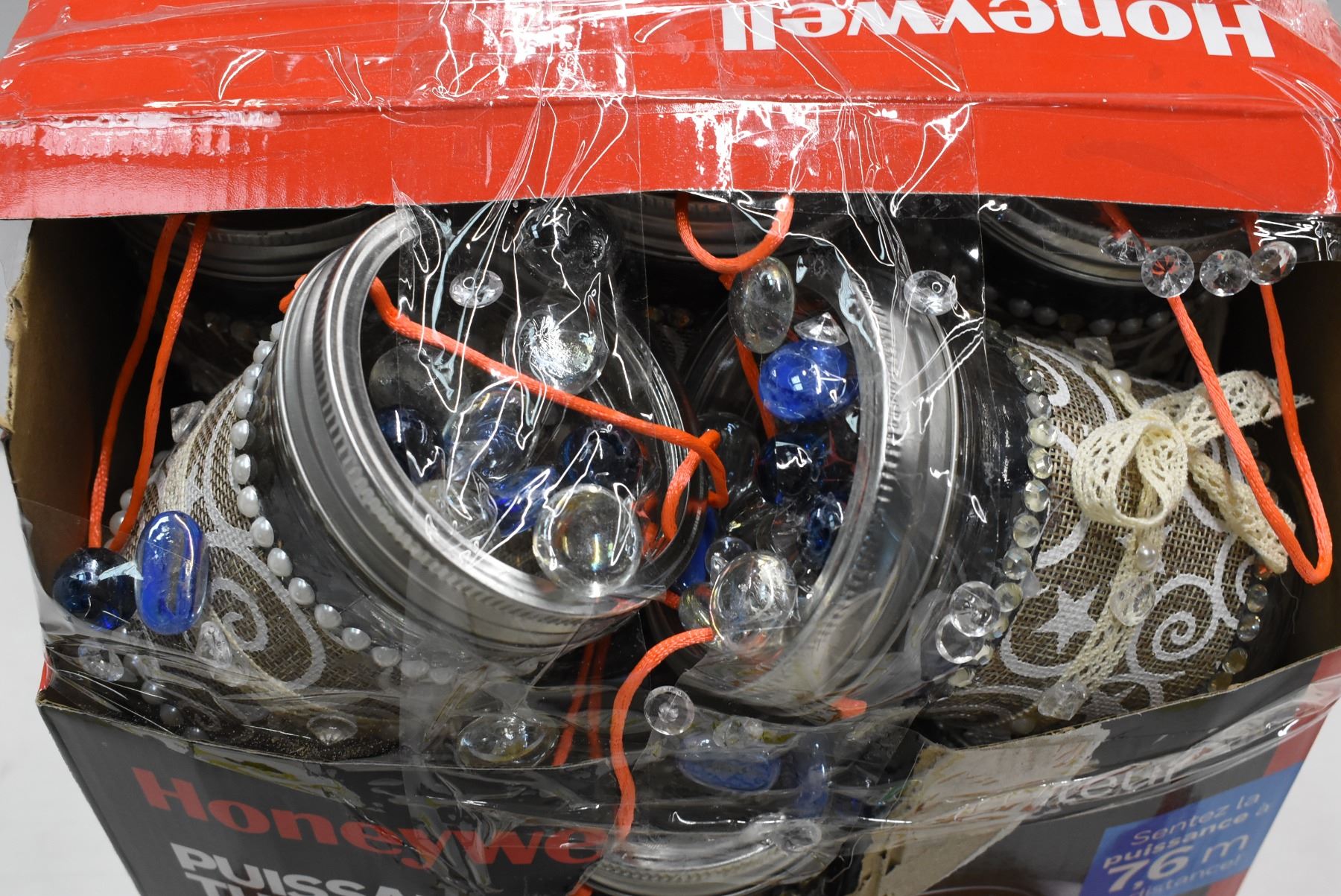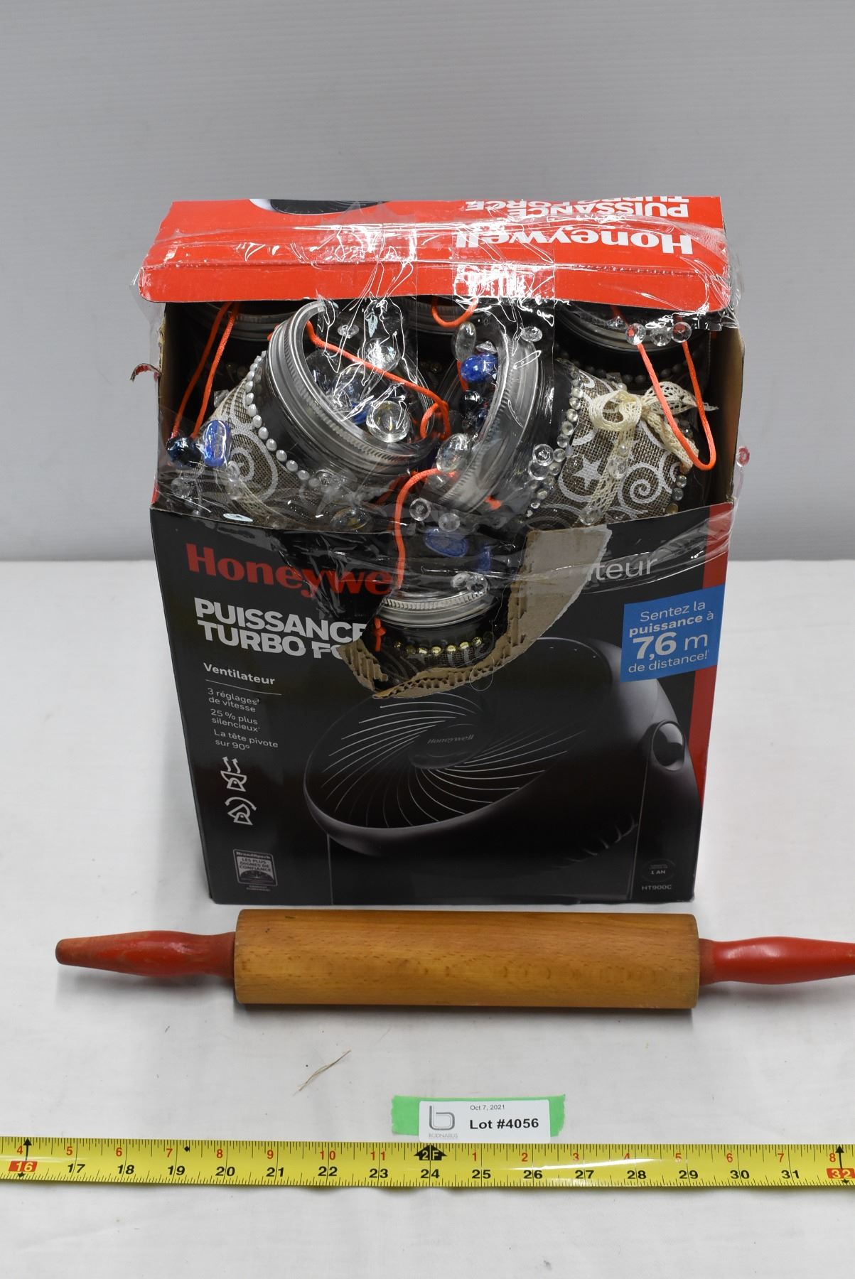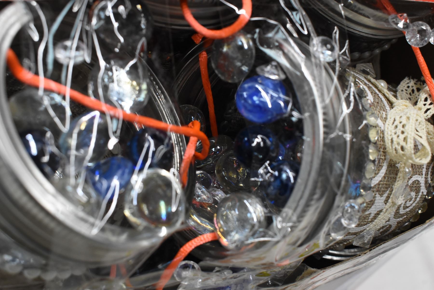 Box with Jars of Decorative Rocks and Gems & Wooden Rolling Pin
