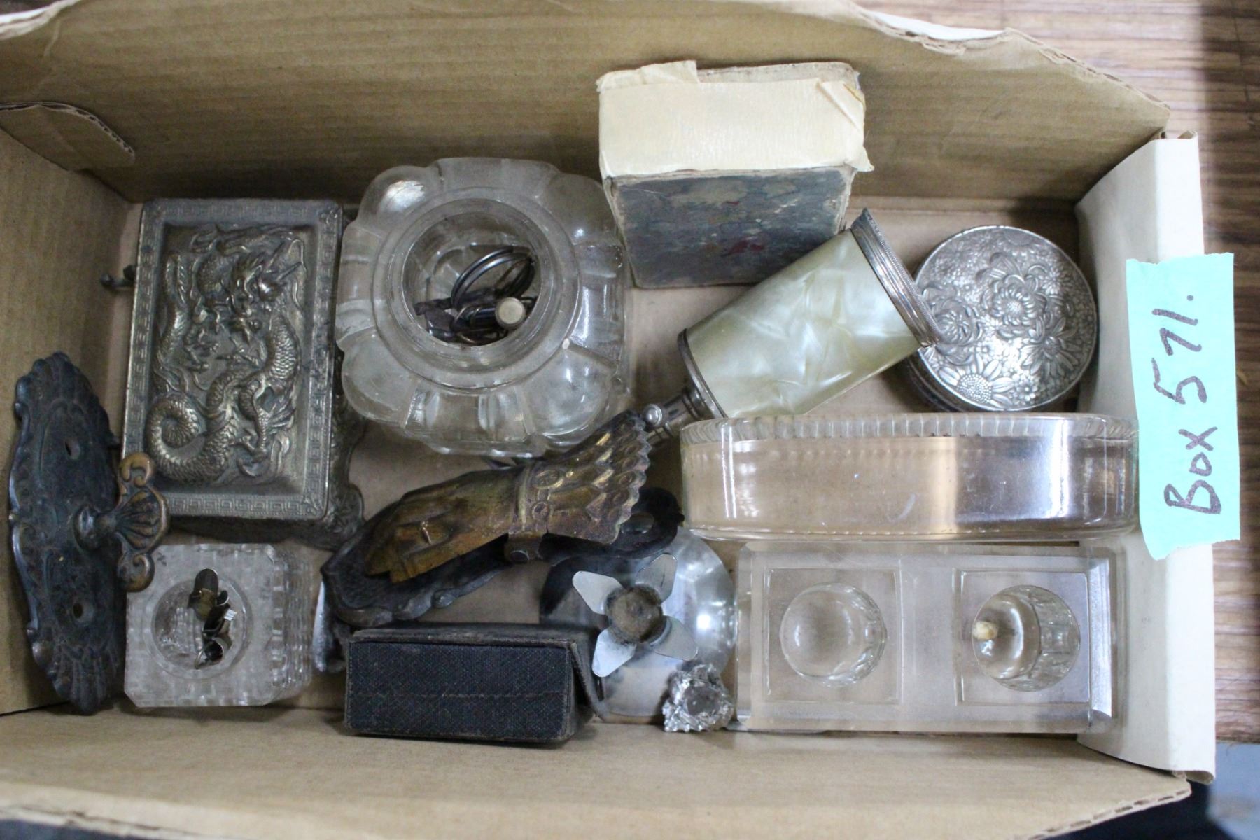 Box with Paper Weights, Inkwells, Nibs, Paper Clips & Misc. Desk Items