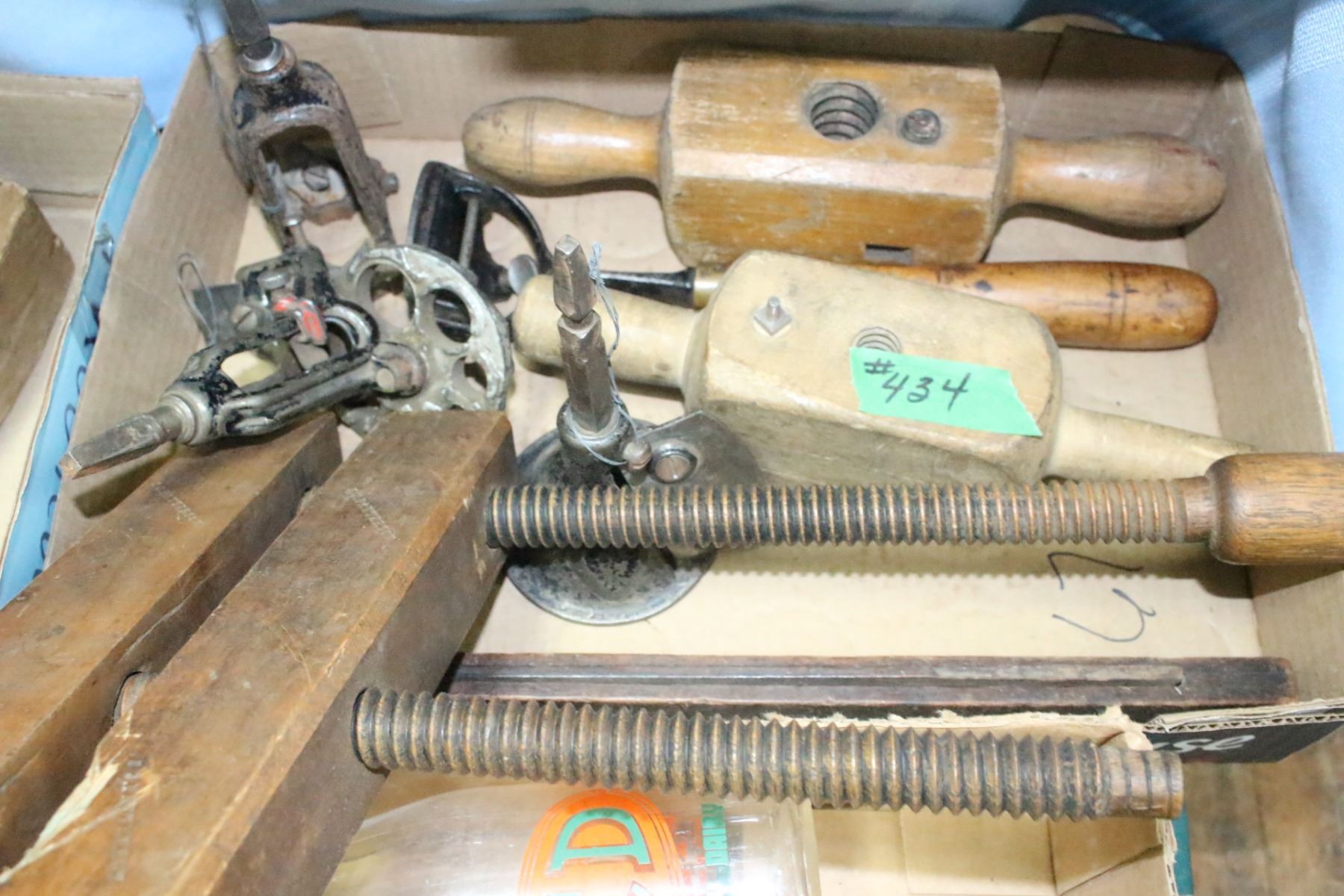 Box with Spoke Sharpeners; Threaders & a Wood Vice