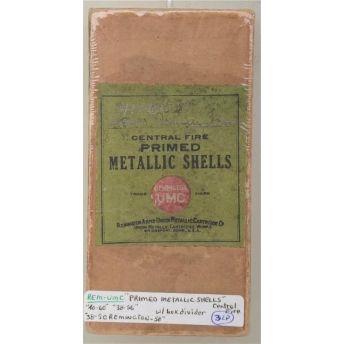 Box with label that reads “Central Fire Primed Metallic Shells”. Box measures 5-1/2” by 2-3/4”, 2-1/4” deep. Near fine condition. Box only. Probably .40-60 or .38-56 caliber shells according to collector’s notes. Est:$25 - $50