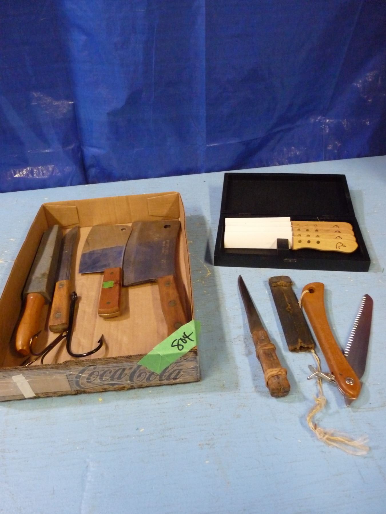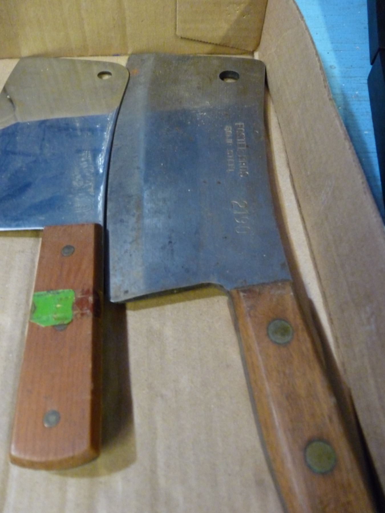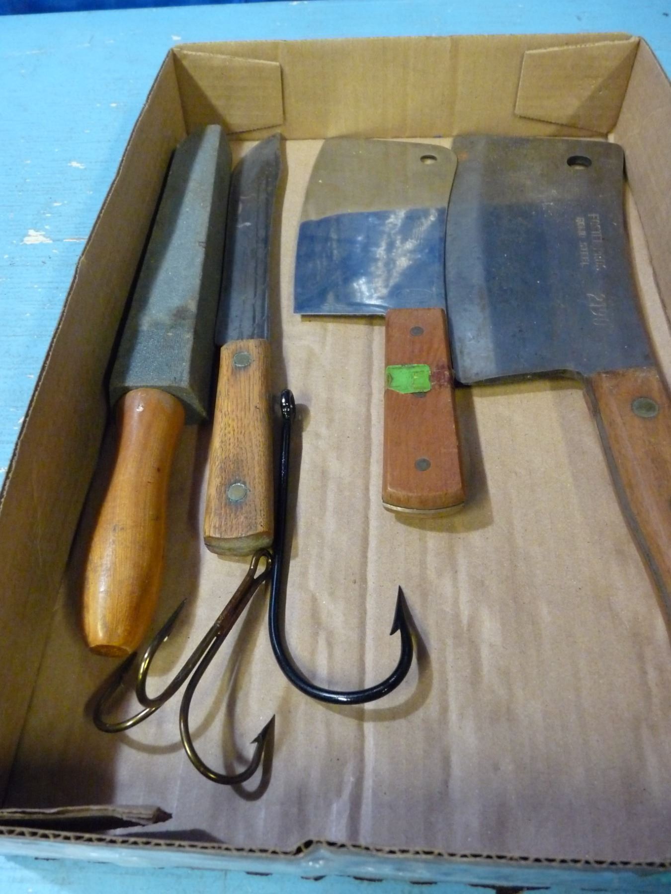 Box with sharpening stone, cleavers , knives, steak knives