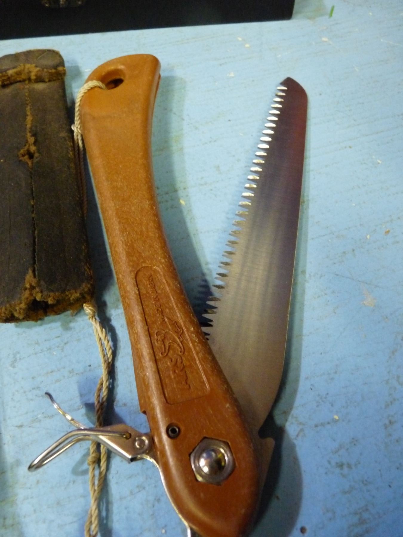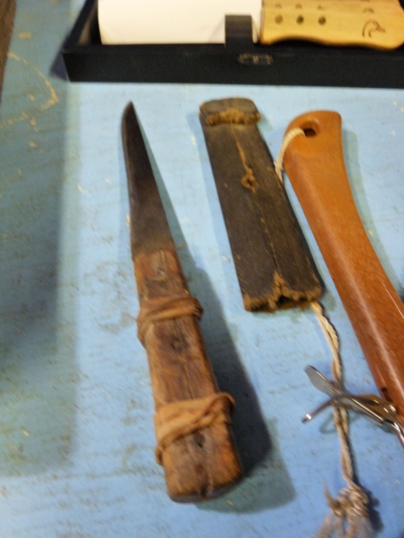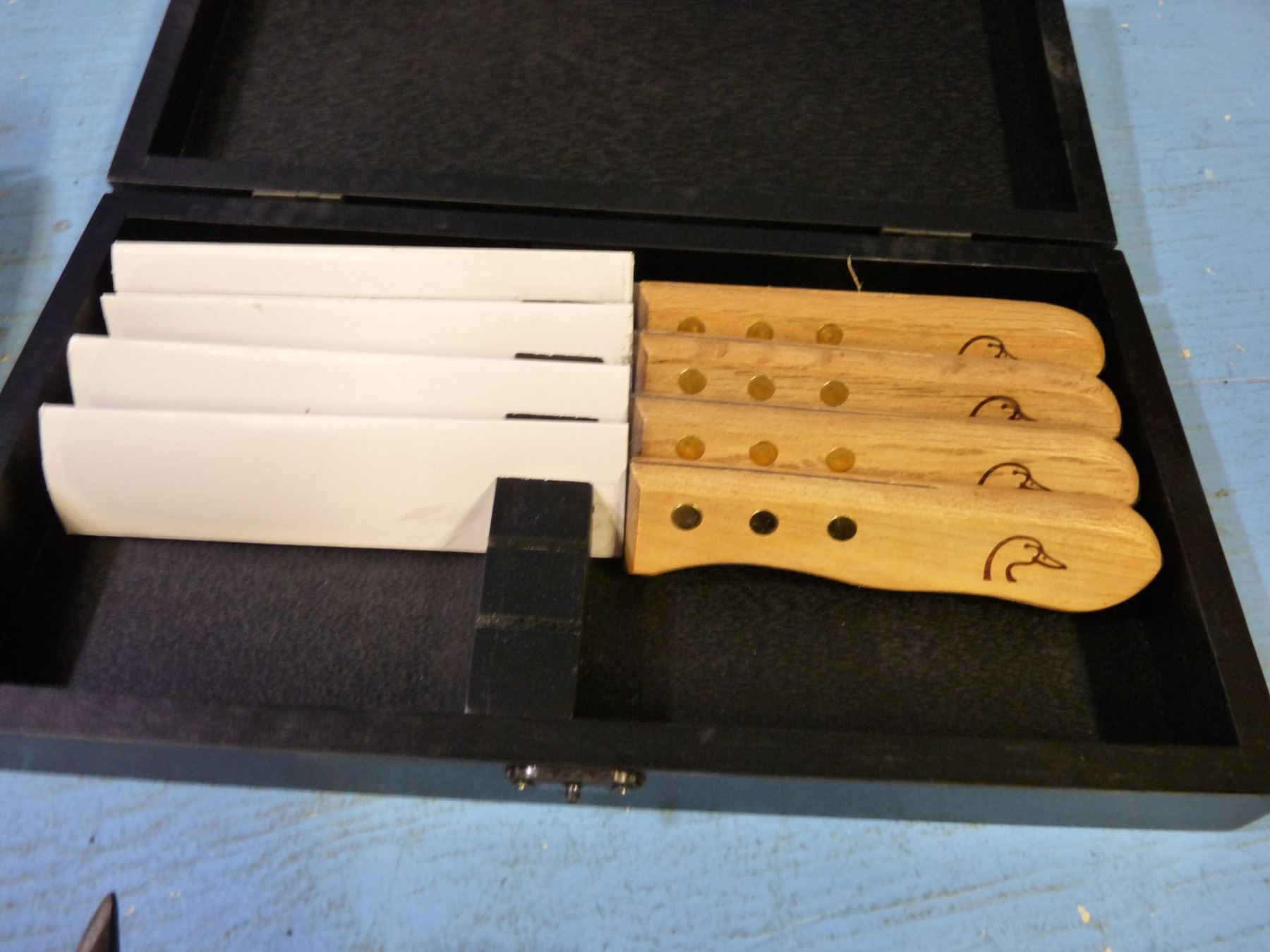 Box with sharpening stone, cleavers , knives, steak knives