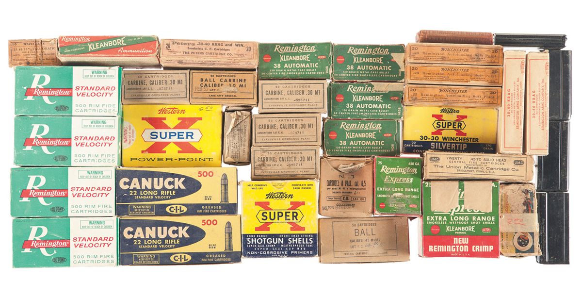 4 boxes Remington 22LR (500/500), 2 boxes Canuck 22 LR (500/500), 4 boxes Remington 38 ACP (50/50, 50/50, 40/50, 47/50), UMC 45-70-500 (20/20), Remington 410 ga (9/25), Remington 12 ga (15/25), Western 12 ga (16/25), Winchester 24 ACP (40//50), Federal 45 ACP (50/50), Western 38LC (43/50), Western 300 Win Mag (20/20), Western 30-30 Win (20/20), Italian 6.5mm (18/18), French 7.65mm (32/32), 2 boxes Remington 30-40 Krag (20/20), Peters 30-40 Krag/Win (20/20), Remington 30-40 Krag (12/20), Winchester 25 Remington Autoloading (20/20), 2 boxes Winchester 25 Remington Autoloading (20/20), 5 arsenal boxes 30 M1 (4x50/50, 1x32/50), with 5 M1 carbine magazines. All counts are estimates.