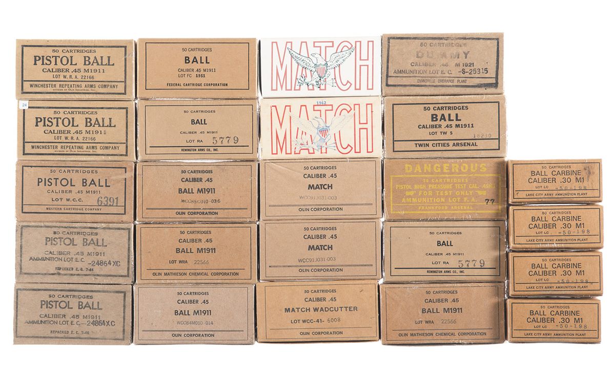 4 boxes Lake City Army Ammunition Plant 30 M1 (50/50), 5 boxes Olin Corporation 45 caliber (50/50), 2 boxes Olin Mathieson Chemical Corporation 45 M1911 (50/50), 2 boxes Remington 45 M1911 (50/50), 2 boxes Winchester 45 M1911 (50/50), Israel Military Industries 45 Match (50/50), Federal 45 Match (50/50), Federal 45 M1911 (50/50), Evansville 45 M1921 Dummy (50/50), Western 45 M1911 (50/50), Twin Cities Arsenal 45 M1911 (50/50), 2 boxes marked "Repacked E.C. 7-44" 45 M1911 (50/50), Frankford Arsenal 45M1 (50/50). All counts are estimates and most boxes are in a protective transparent wrapping.