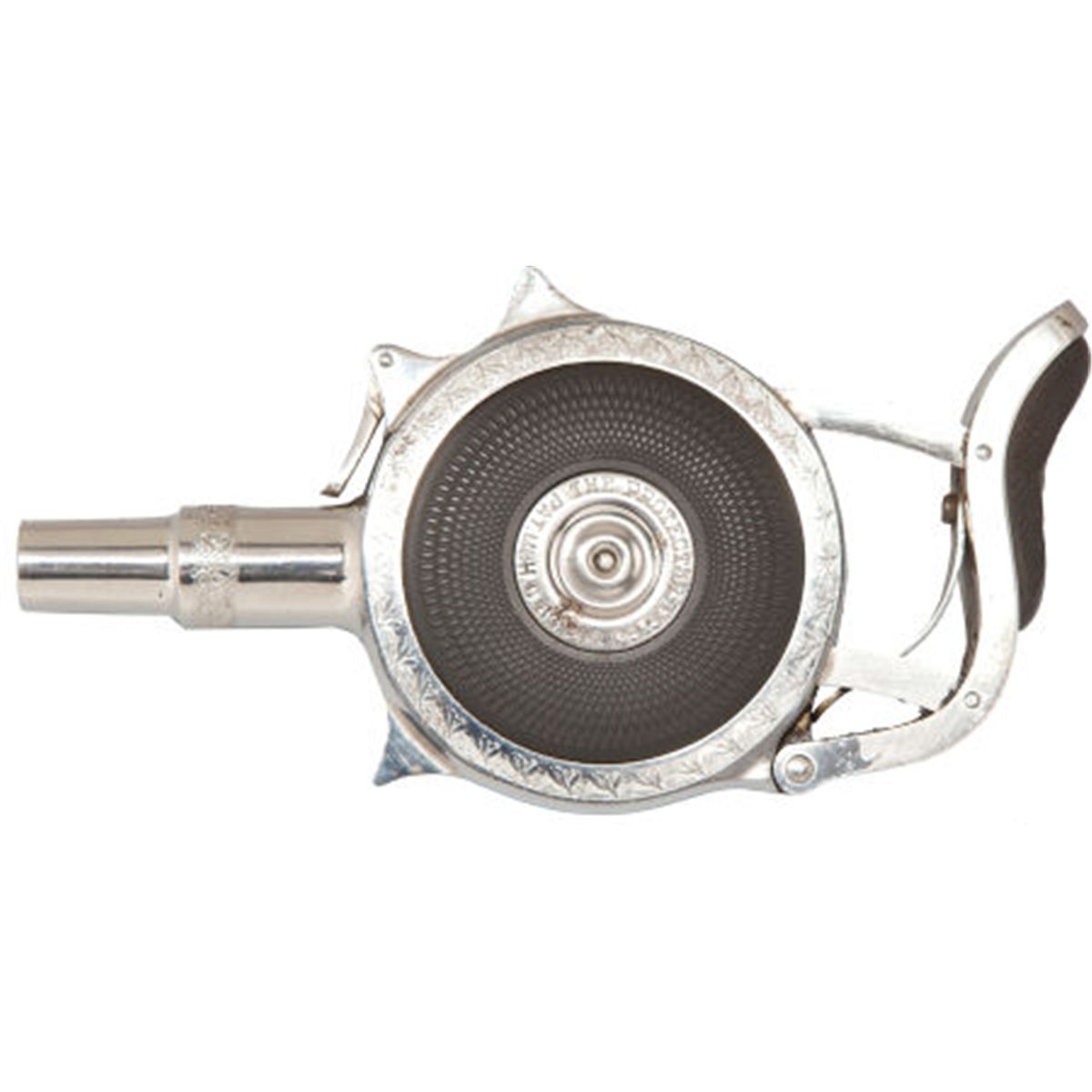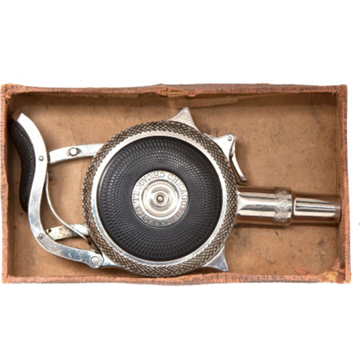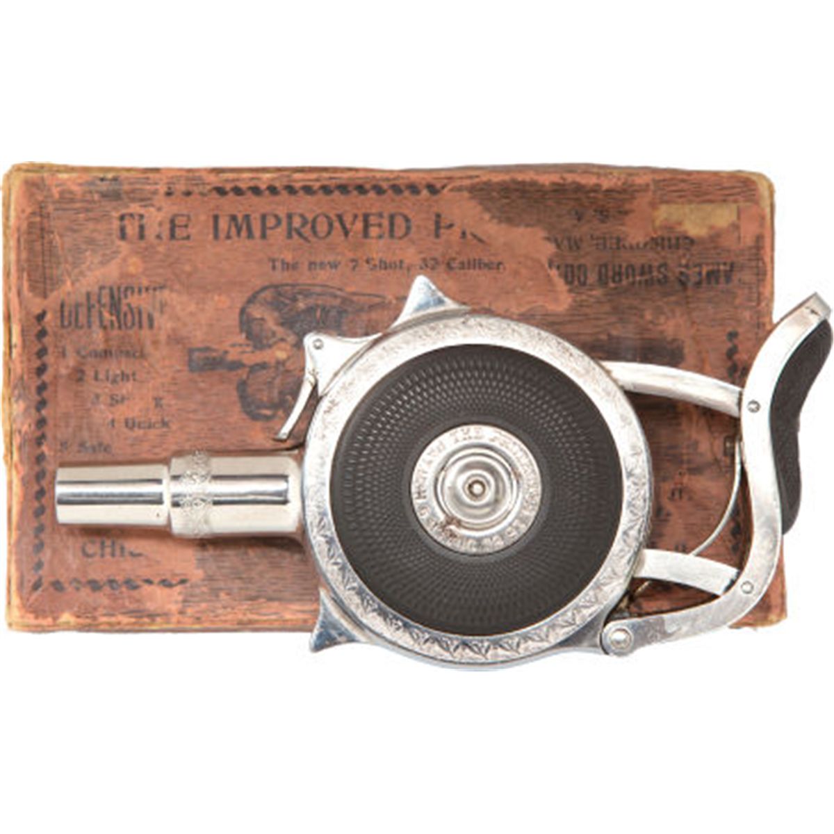 Boxed Chicago "The Protector" Palm Pistol. c. 1890 Serial no. 412, .30 caliber, Nickel-plated finish. Textured hard rubber panels and palm pad. Sides of panels with dentate borders and center escutcheon with legend: The Protector/Pat. Mch. 6.83. Aug.29.93. Compression action. Contained in original "picture" box with pink paper cover and illustration of revolver on top. Printed instructions on inner lid with dealer address reading: Ames Sword Co. Chicopee, Mass. Estimated number manufactured 12,800 [see Flayderman 8A-038, page 473]. Condition: Excellent to mint. Box with scuffs, repairs and minor losses to text.