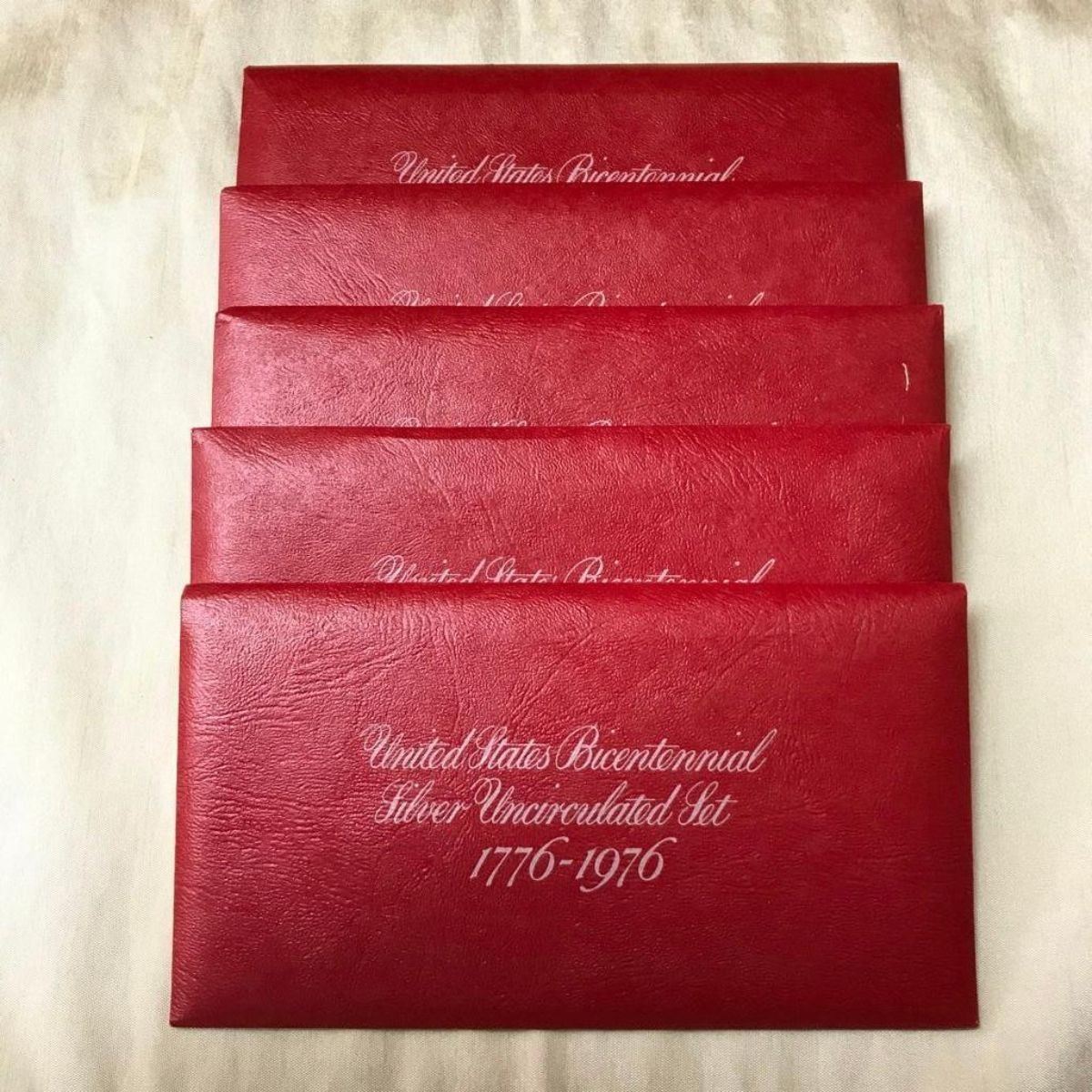 Original box containing 5 sets of 1976 United States Bicentennial Uncirculated silver coins, ( silver dollar, half-dollar & quarter ) all in original packaging with envelope sleeves, inside original mailer box from Bureau of The Mint, San Francisco CA. Registered # 2175677, box dated 1974, with postal stamp dated July 7, 1975. Coins were never assembled into display frames.