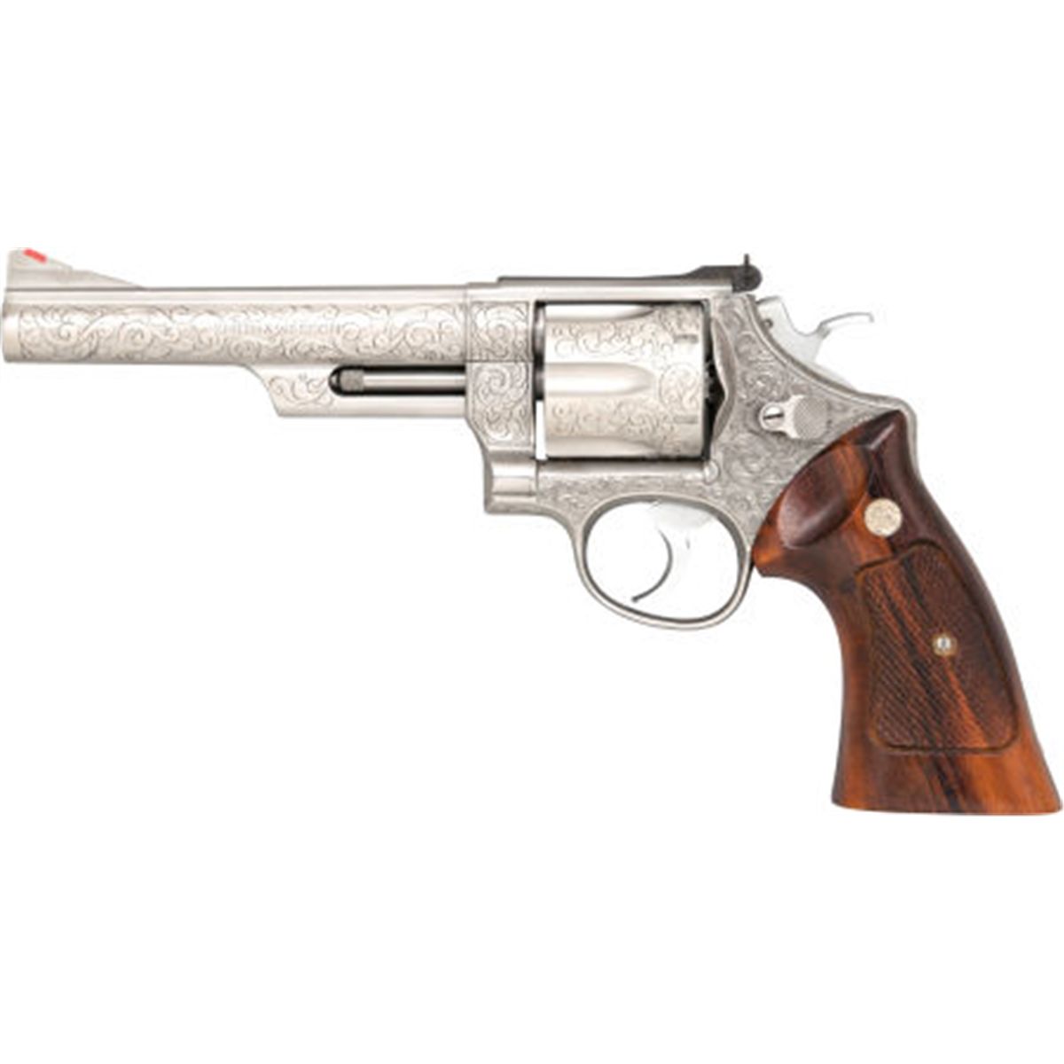 ***Boxed Engraved Smith & Wesson Model 629-1 Double Action Revolver by Weldon Bledsoe, Haltom City, Texas. Serial no. N926684, .44 magnum caliber, 6-inch barrel with target sights. Stainless steel construction. Fully scroll-engraved in 1970s by master engraver Weldon Bledsoe of Haltom City, Texas. Checkered walnut grips with medallions. Contained in original factory box with instructions. Condition: Excellent.