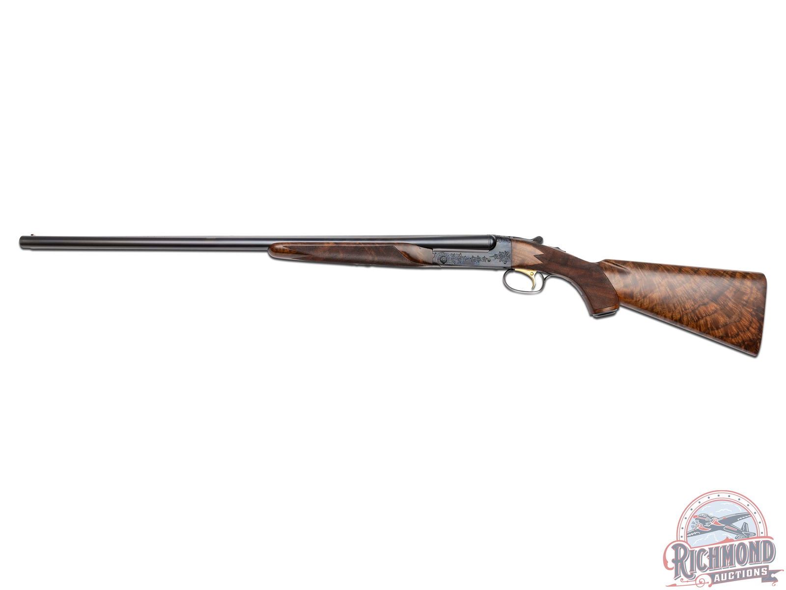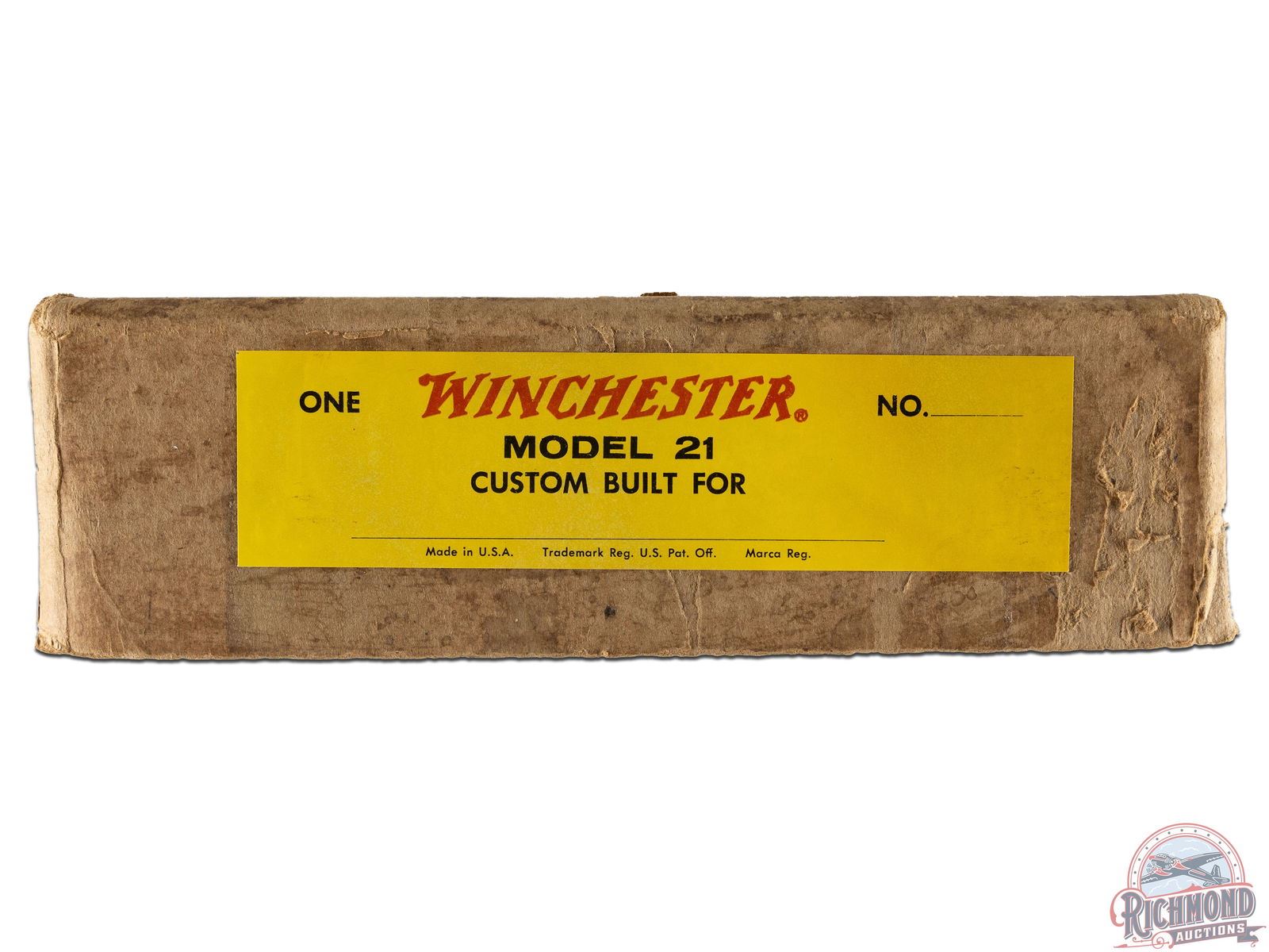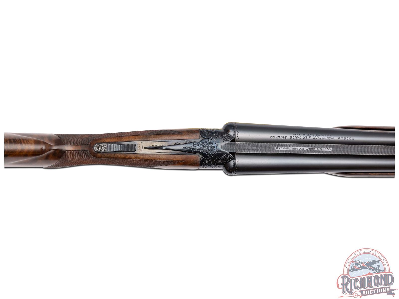 Made by Winchester Repeating Arms in 1974. Gun is fitted with 26" blued Winchester Proof Steel barrels in 20 Gauge with 2-3/4" chambers, ejectors, ivory bead front sight and middle sight, matted rib marked "Custom Built by Winchester" with WS-1 and WS-2 chokes. Left top barrel is marked with "Model 21 Winchester 20 Gauge 2 3/4 Cham/Address". Blued "Flatside" action with No. 1 style factory engraving, gold washed single selective trigger and non-automatic safety. Select Feathercrotch walnut pistol grip checkered stock with checkered wood butt and plain blued steel grip cap. Matching Skeet style beavertail forearm with floral engraved blued roller latch. Gun comes in original style two piece box with red Winchester markings, cardboard inserts, Model 21 hanging tag and 21 instruction sheet. Cody factory research verifies all options. LOP: 14". DAC: 1-9/16". DAH: 2-1/2". CALIBER: 20 GA. S/N: W22150. FFL STATUS: Curio & Relic.