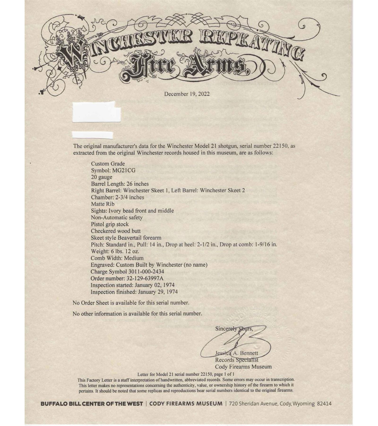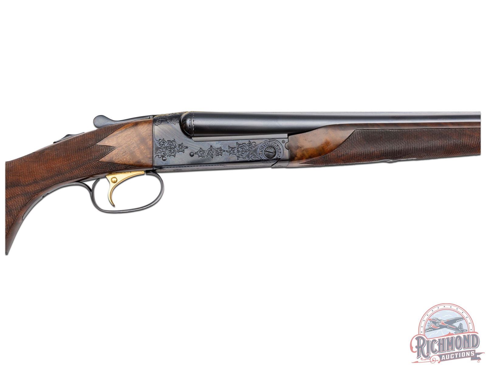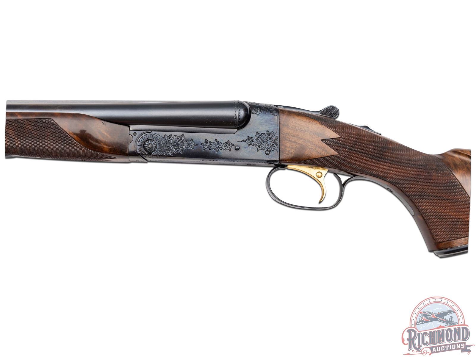 Made by Winchester Repeating Arms in 1974. Gun is fitted with 26" blued Winchester Proof Steel barrels in 20 Gauge with 2-3/4" chambers, ejectors, ivory bead front sight and middle sight, matted rib marked "Custom Built by Winchester" with WS-1 and WS-2 chokes. Left top barrel is marked with "Model 21 Winchester 20 Gauge 2 3/4 Cham/Address". Blued "Flatside" action with No. 1 style factory engraving, gold washed single selective trigger and non-automatic safety. Select Feathercrotch walnut pistol grip checkered stock with checkered wood butt and plain blued steel grip cap. Matching Skeet style beavertail forearm with floral engraved blued roller latch. Gun comes in original style two piece box with red Winchester markings, cardboard inserts, Model 21 hanging tag and 21 instruction sheet. Cody factory research verifies all options. LOP: 14". DAC: 1-9/16". DAH: 2-1/2". CALIBER: 20 GA. S/N: W22150. FFL STATUS: Curio & Relic.