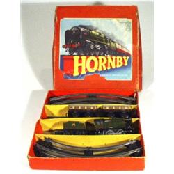 Boxed Hornby 00 gauge tinplate train set including clockwork locomotive and tender and two carriages with track