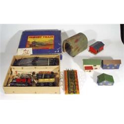 Boxed Hornby clockwork tinplate train set with LMS locomotive, furniture removal service wagon, open wagon, track and signals together with wooden buildings, tunnel and a Mettoy bridge