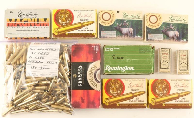 Including; Federal 300 Weatherby Mag-20 Rds, Remington 300 Wby Mag-14 Brass, Weatherby 300 Wby Mag-37 Rds, Weatherby Ultra Velocity 300 Wby Mag-30 Rds, Winchester 22 WRF-100 Rds, Ready to load 300 Wby fired Fed 215M primers-180 Rds, and 2 empty boxes Weatherby Ultra Velocity 300 Wby Mag-one with 9 brass.