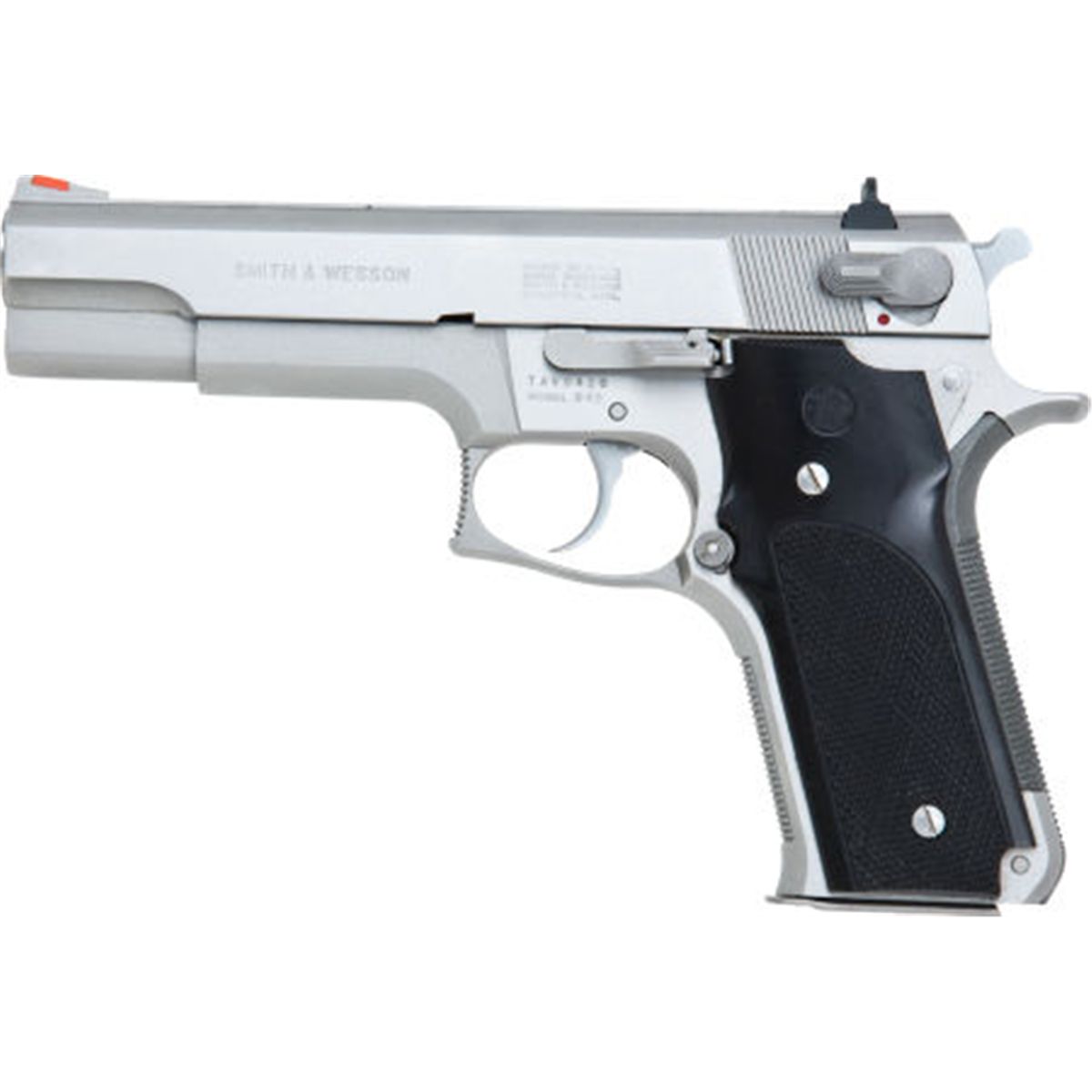 Boxed S&W Model 645 Semi-Automatic Pistol. Serial No. TAV0420, .45 caliber, 5-inch barrel. Stainless steel finish with black molded nylon checkered grips. Fixed sights. Ambidextrous safety feature. Textured frontstrap and backstrap. Sold together with original S&W box, cleaning kit and instructional manual.Condition: Very good. Retaining approximately 98-99% finish. Light dings and fine scratches from poor handling. Bore is bright. Action crisp. Box in very good condition.NRA FIREARMS FOR FREEDOM PROGRAM