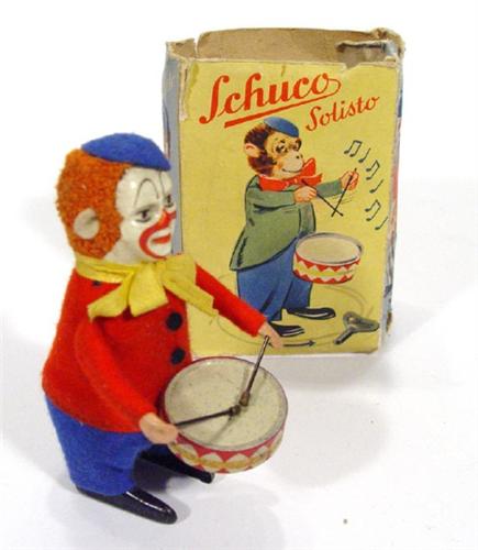Boxed Schuco clockwork drumming clown figure, 10cm high