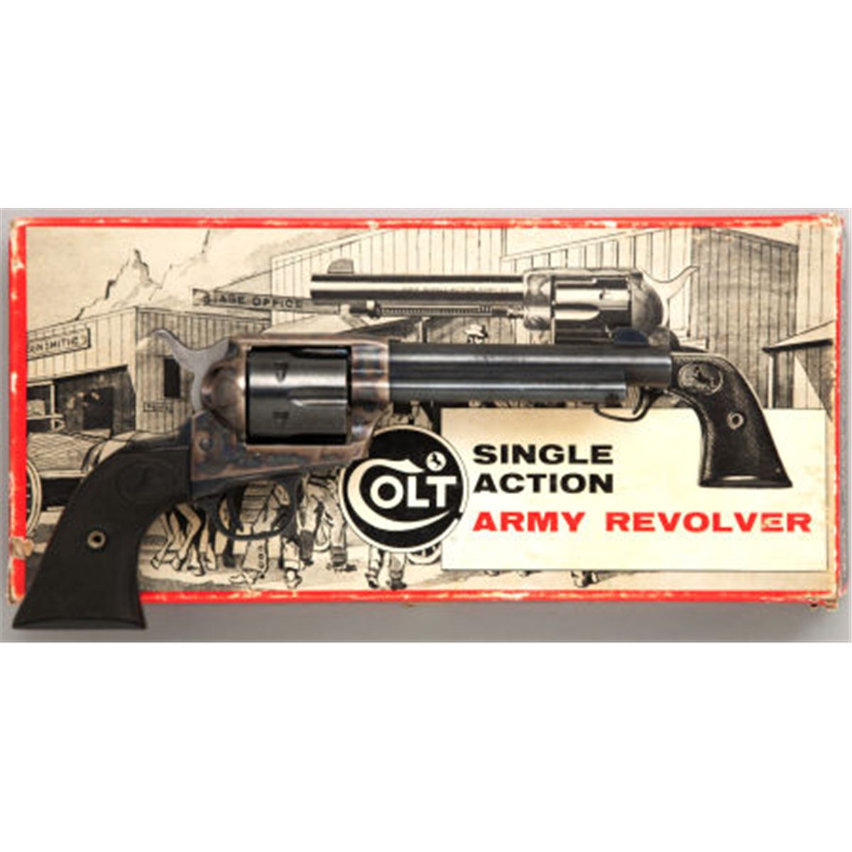 **Boxed Second Generation Colt Single Action Revolver. **Serial no. 51412SA, .45 caliber, 5 1/2-inch barrel. Blued finish. Rampant Colt hard rubber grips. Contained in original black and red factory stage coach box. Condition: Excellent to mint. Box with scuffs and tears to corner seams.