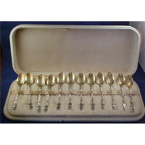 This is the most amazing set of 12 sterling silver demitasse spoons by Whiting! They are a unique pattern, possibly specially made, featuring a classically inspired design of an urn of roses on top of a column. The design in repeated on the back of the handle. The gold washed bowls each have a wreath or garland of flowers with a bow. The backs of the bowls are monogrammed V. The spoons are each 4 1/4" long and in pristine condition. They are in a white leather presentation box. It has the Whiting mark and patent dates and is also stamped Frank Herschede Cincinnatti. The box shows some light wear and spots but is a really neat addition to this set and is in very nice condition for its age.