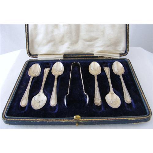6 English Teaspoons 4.1/4" long ( They do not fall of the saucer!) and a pair of unmatched sugar tongs marked EPNS for Electro Plated Nickel Silver. In a box that has wear. The hinge is Excellent but there is a crack in the top of the box which is wood covered with a leather looking material, dark blue in colour. Great Gift for the Tea Drinker!