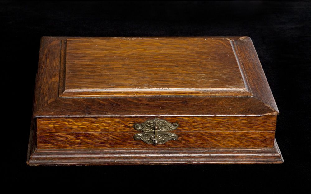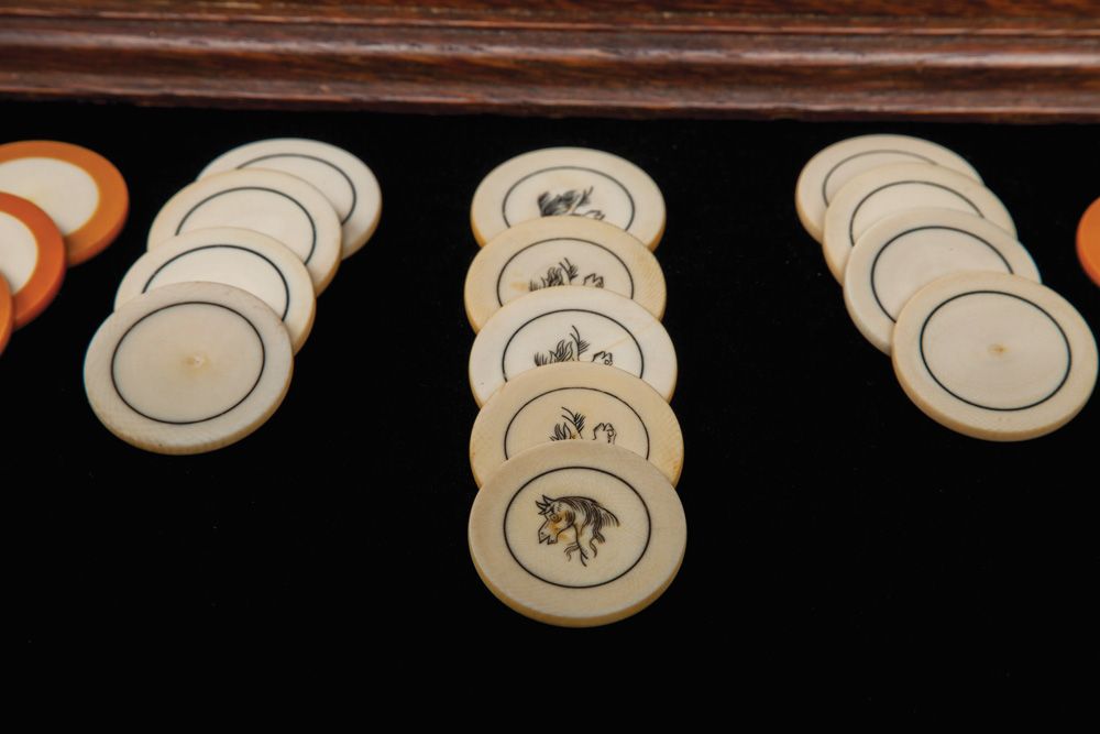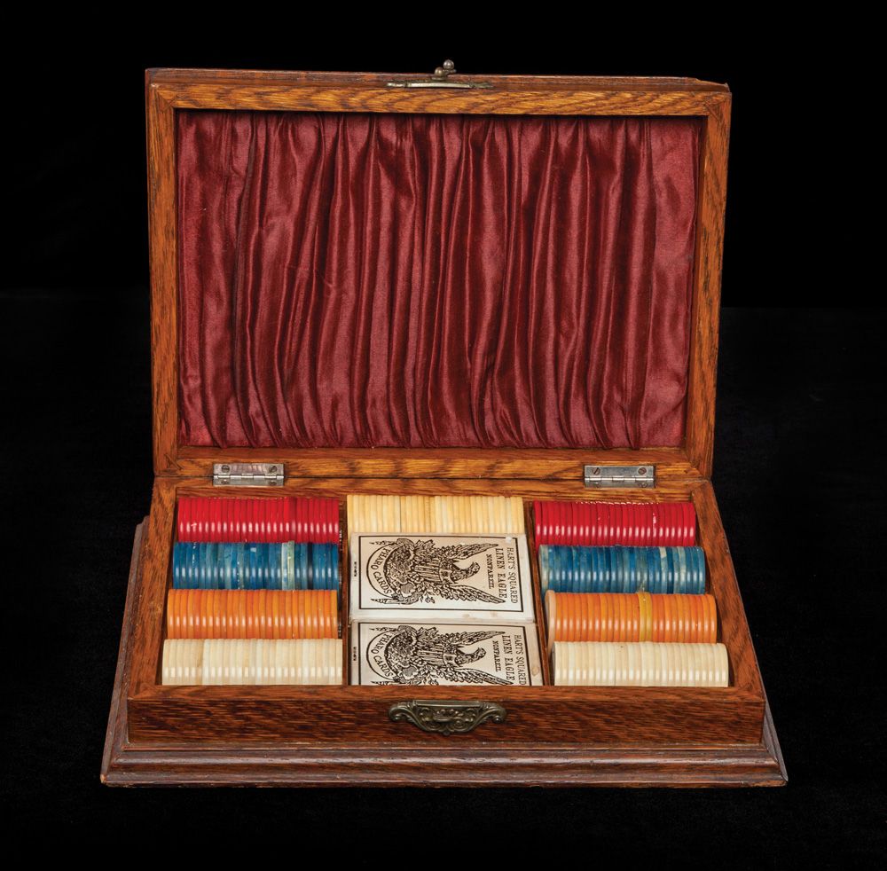 Boxed Set of Antique Poker Chips. Set of original 1880s poker chips in oak case. 238 total chips, 52 each of red, blue, orange and natural concentric edges, 30 horse heads, and 2 decks of later Hart's Pharo cards. Case measures 9 1/2" x 13" x 3 1/2" tall. All chips are circa 1880s.