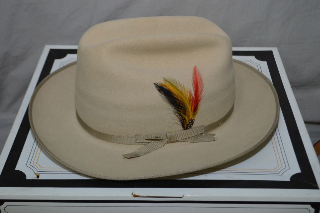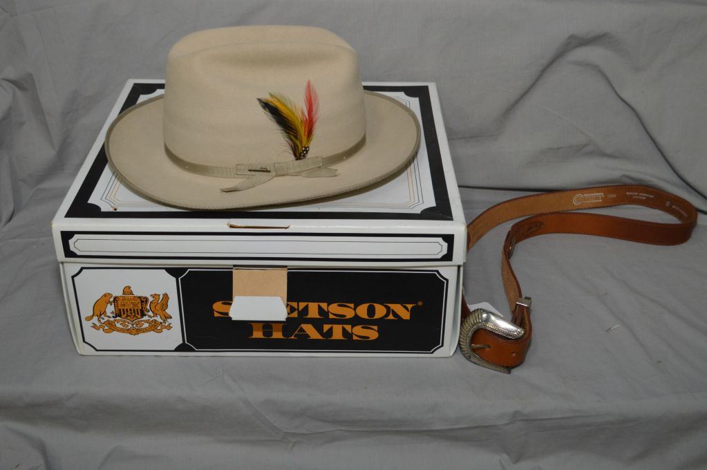 Boxed Stetson hat with adjustable 6 5/8" wood and metal hat stretcher and Stetson box plus a Stetson leather belt, note point of interest vintage "Spencer Auctions" auction chit