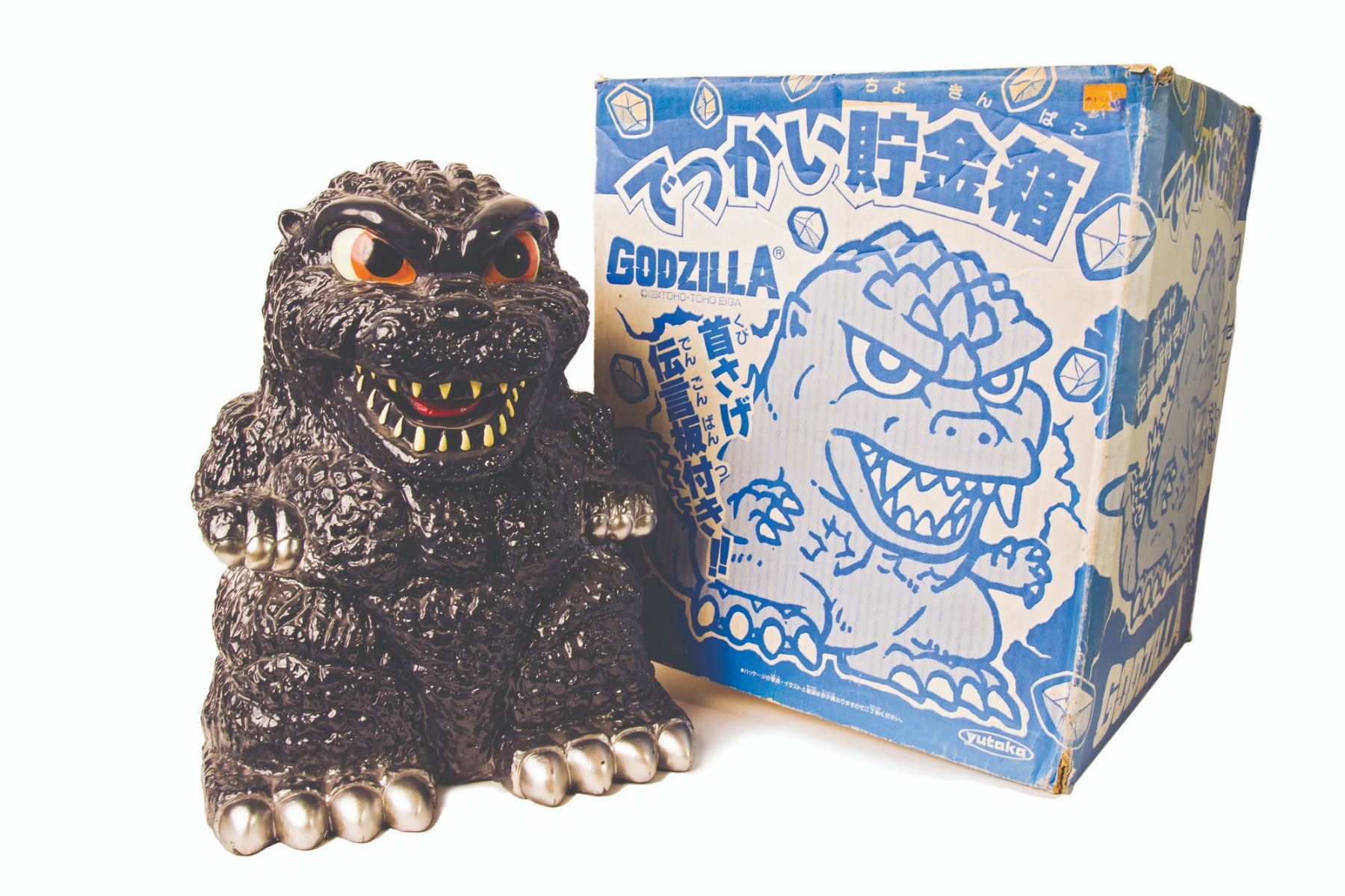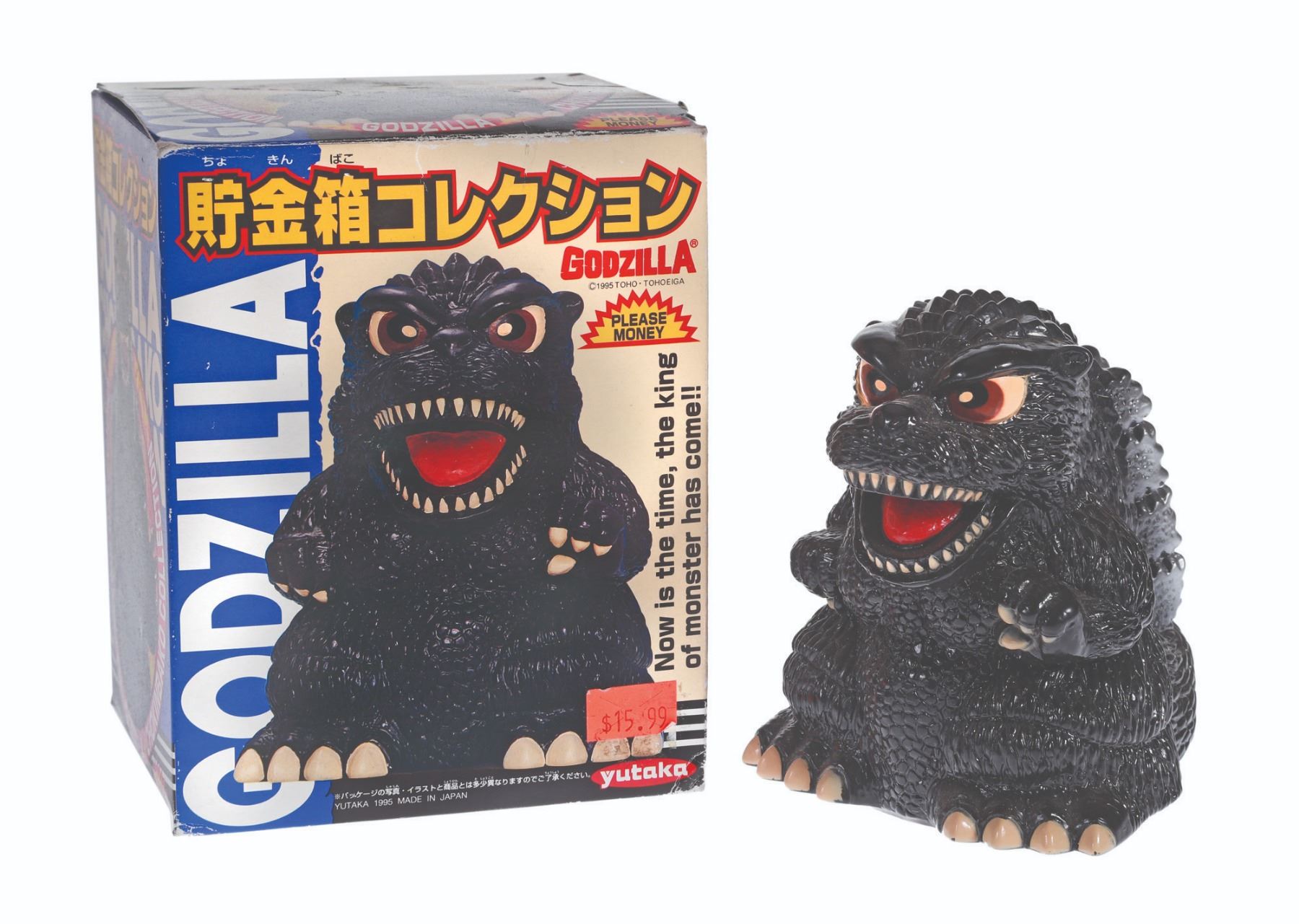 1994. Yutaka Small Boxed Godzilla Bank, Large Boxed with dry erase board, pen & Godzilla shaped foam eraser. Large Bank:12x9x11 Small Bank: 4. 5”x4”x5”. VG+.