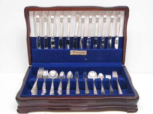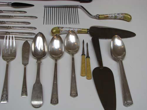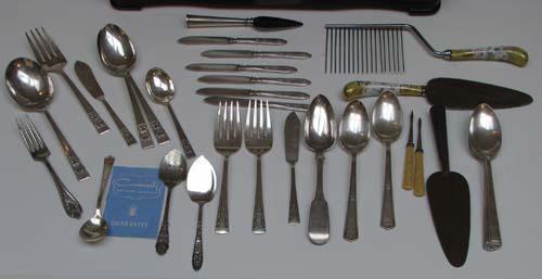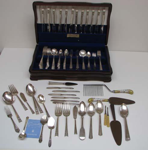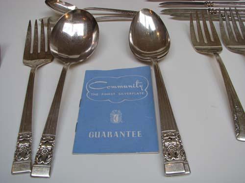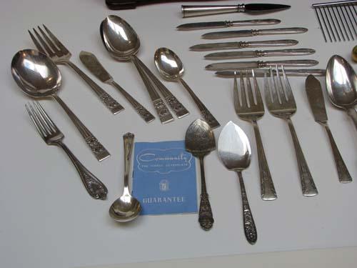 Title: Partial Set of Community Silverplate flatware with additional service pieces by other makers including Cake knifes, additional Soup spoons, forks, spoons various sizes and various serving utencils