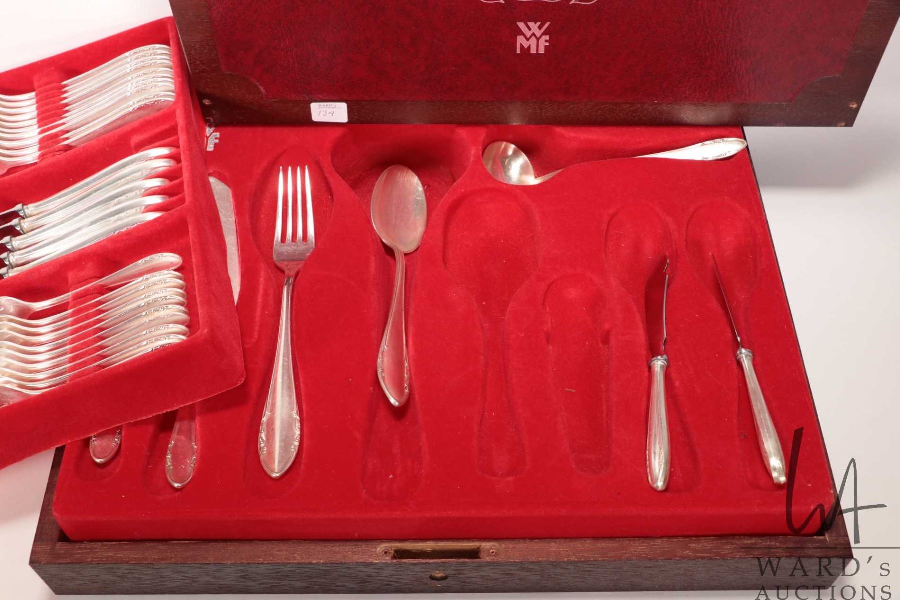 Boxed set of WMF Silco German made flatware including ten each of dinner knives, dinner forks, tablespoons, teaspoons, dessert forks and seven serving pieces