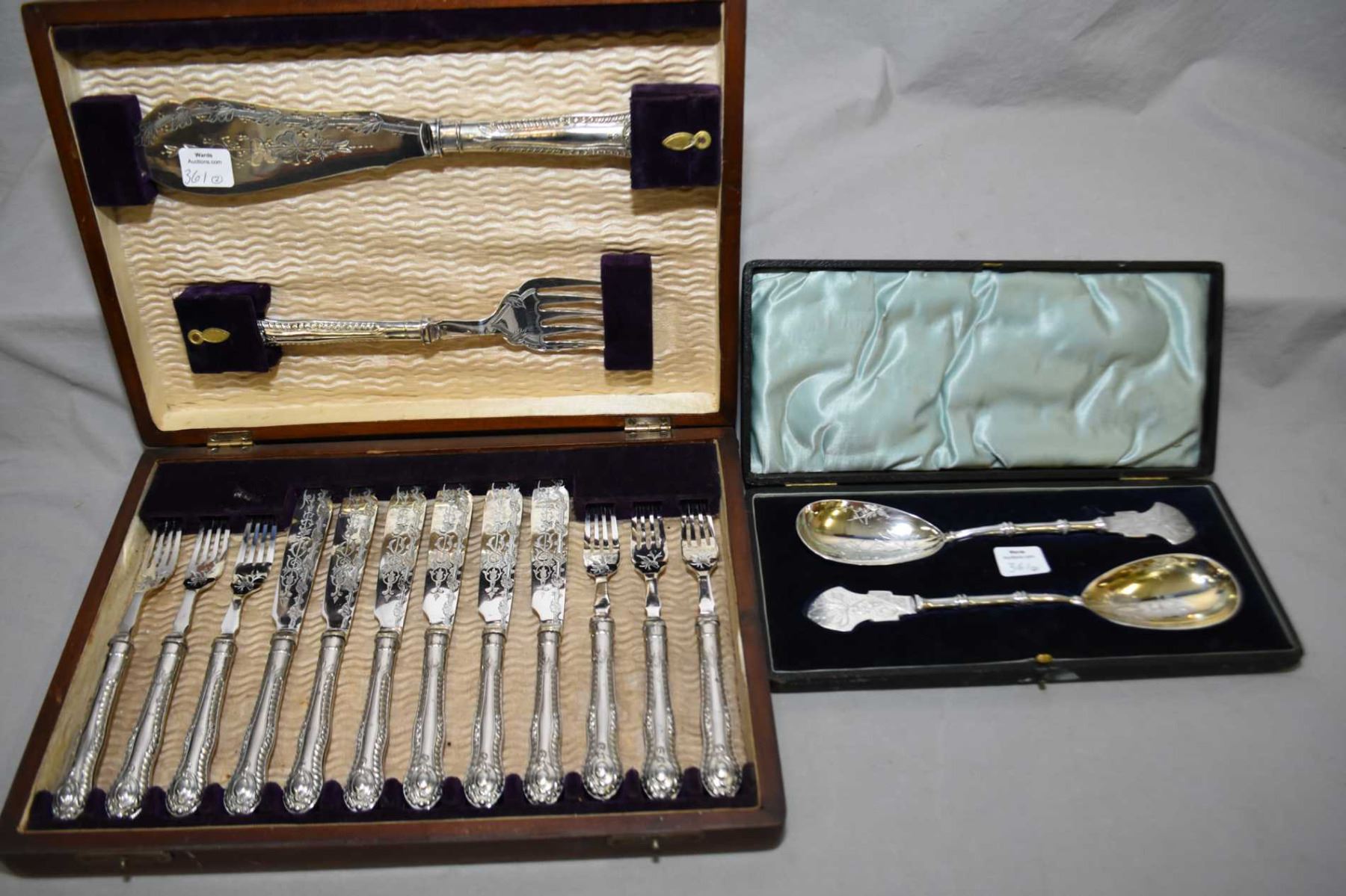 Boxed silverplate and heavily engraved fish knife set with servers and six fish knives and forks plus a pair of silverplate serving spoon in fitted box