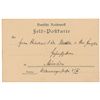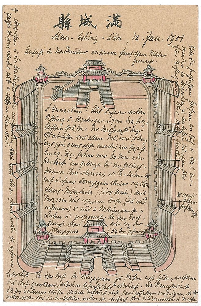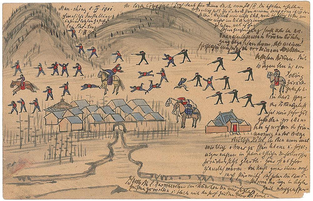Two German field postcards written and sketched by a soldier in the German troops at the second international expeditionary force in China during the Boxer Rebellion, measuring 5.5 x 3.5 and 3.5 x 5.5, dated January 12 and April 8, 1901. The soldier reports to his cousin in Munich on the advance of troops and various military operations during the China campaign on the occasion of the Boxer Rebellion. The first postcard shows the city walls of Beijing, intricately sketched in ink and watercolor, and the second postcard focuses on actions in Tshang-cheng, featuring an incredible detailed illustration of a battle in the mountains near the city. In fine condition, with a chip to one corner tip and scattered light creases. The Boxer Rebellion was motivated by Chinese proto-nationalist sentiments and opposition to foreign imperialism and Christianity, with conflict erupting shortly after Germany seized control of Shandong province, bringing about heightened tensions between foreigners and peasants. Ultimately, an alliance of British, Russian, American, Japanese, French, and German troops quashed the uprising and signed treaties in September 1901. These postcards not only offer terrific first-person insight from the front lines, but are in themselves extremely desirable pieces of artwork—a format infrequently seen from a primary source perspective.