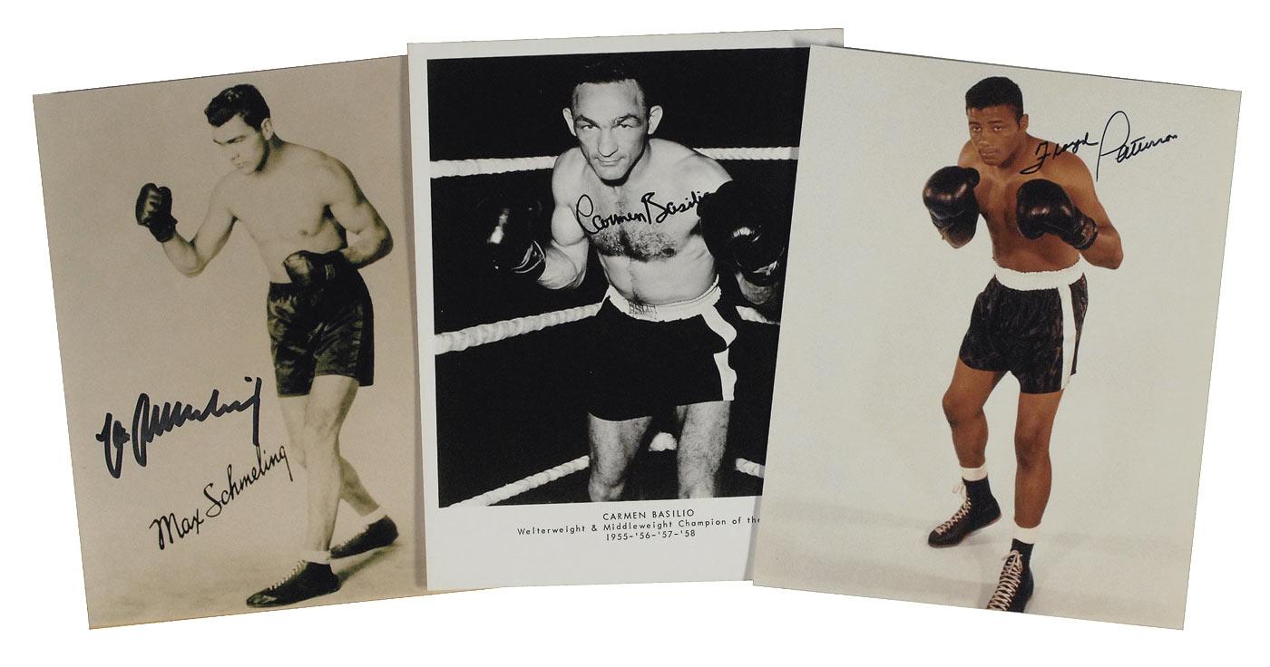Three signed photos: color glossy 8 x 10 of Floyd Patterson, signed in black felt tip; satin-finish 8 x 10 of Max Schmeling in his prime, signed in black felt tip; and a glossy 8 x 10 of Carmen Basilio in the ring, also signed in black felt tip. In fine overall condition.