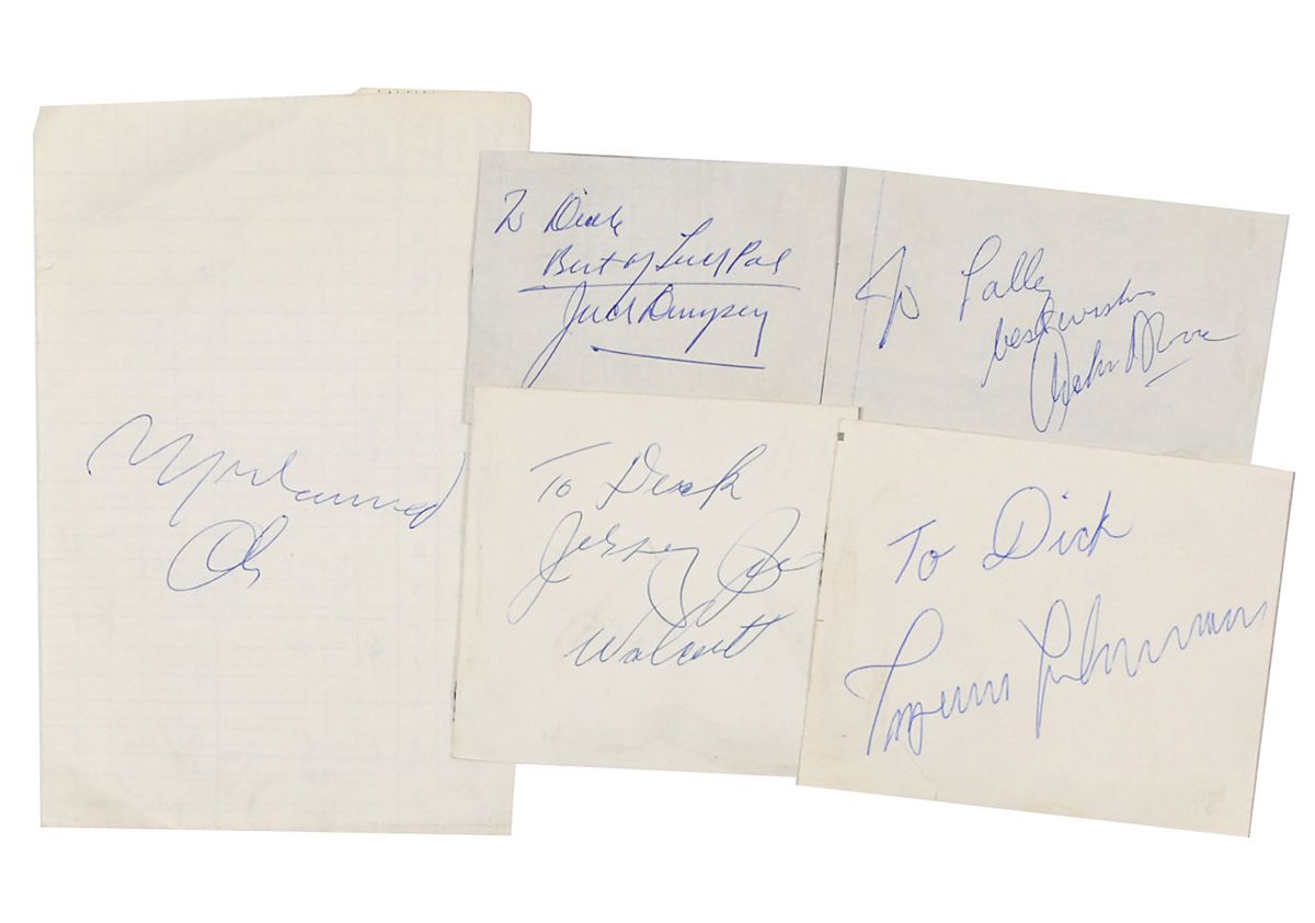 Five ballpoint signatures of Muhammad Ali, Jack Dempsey, Jersey Joe Walcott, Archie Moore, and Ingemar Johansson on individual cards and slips. In overall very good to fine condition.
