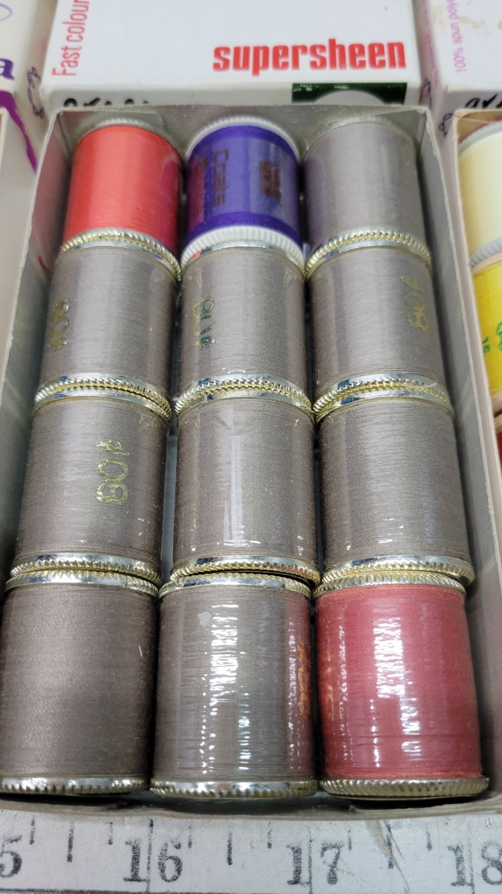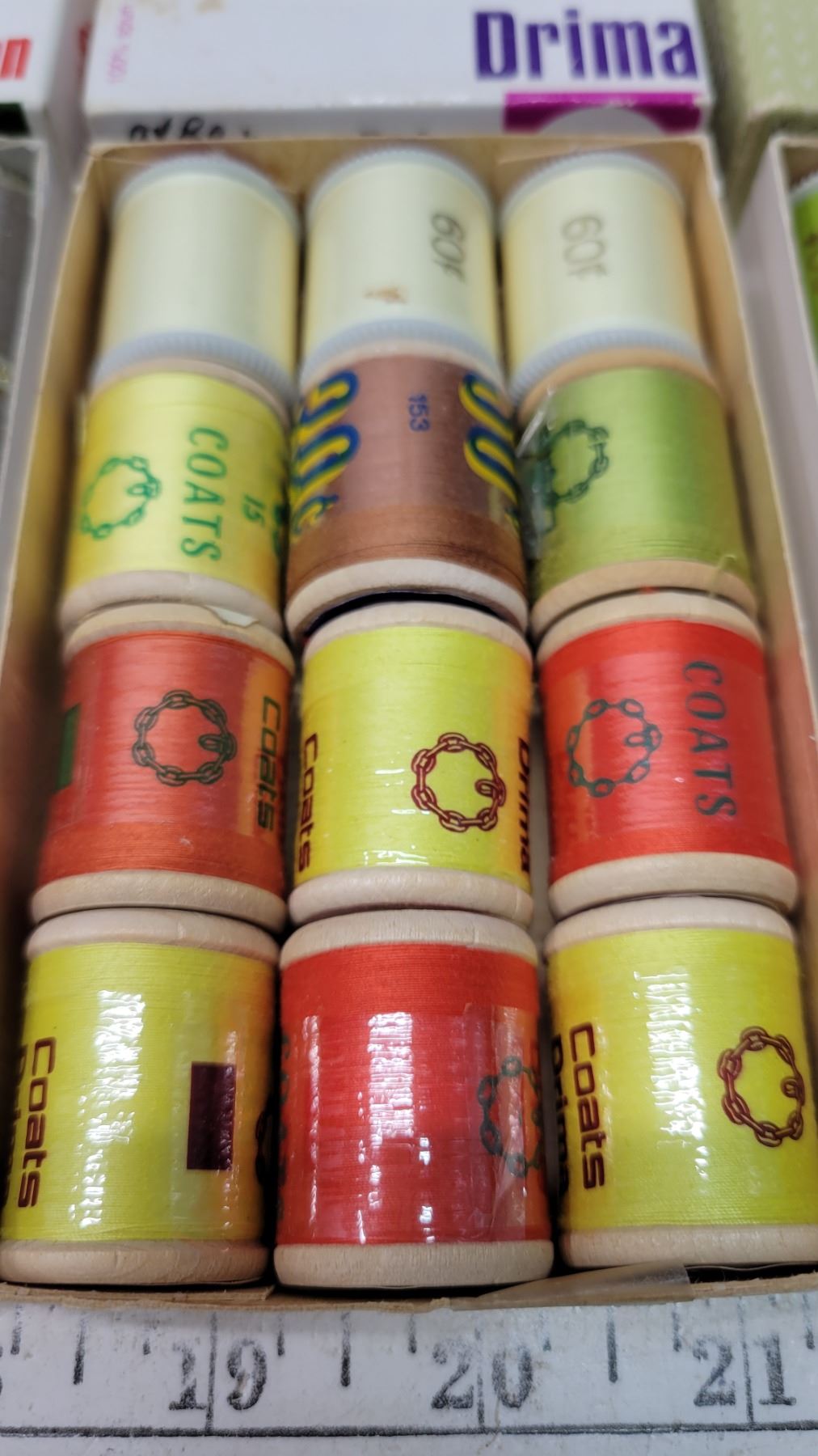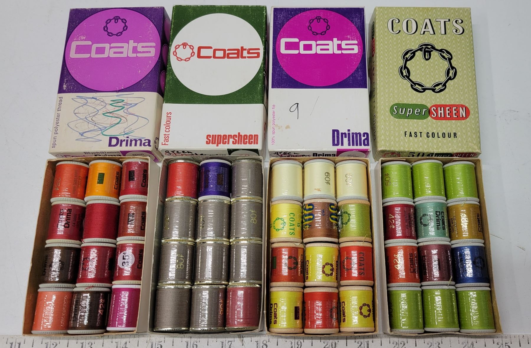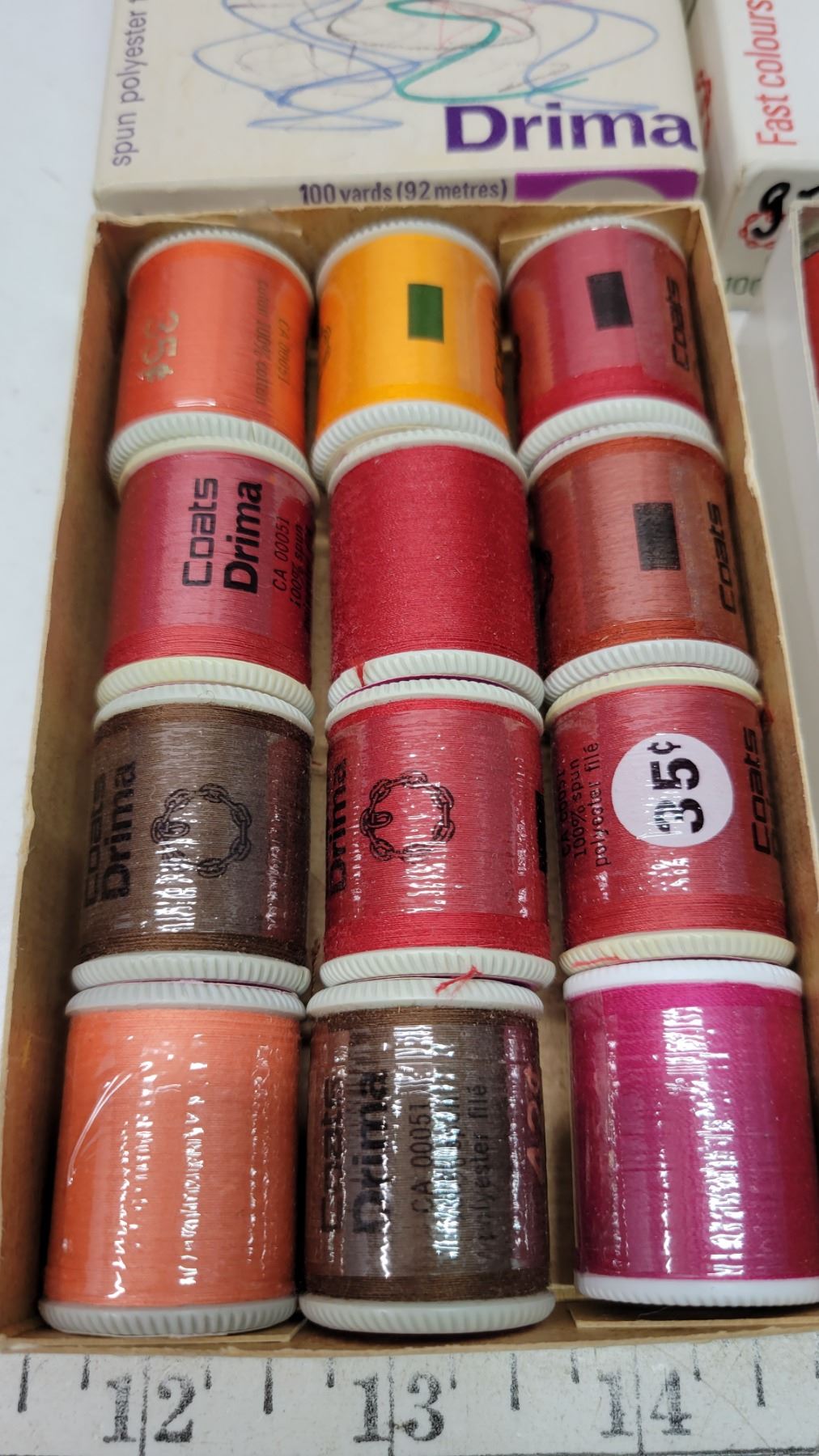 Boxes of vintage Coats and Drima threads, priced wrappers, 12 per box