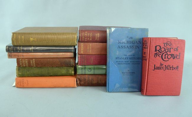 Boxing Books including Recollections of a Boxing referee by Joe Palmer (1927), Fighting was my Business by Jimmy Wilde (1938), My Sporting Memories (1925), Fights for the Championship (vol 2), My Fighting Life by Georges Carpenter (1920), Thirty Years a Referee signed by the author Eugene Corri (1915), John L. Sullivan (1925), From Milo to Londos (1936), The Sweet Science (1926), Boxers and their Battles (1900), A Man Must Fight (1933), Jack Dempsey (1929), The Michigan Assassin (1946), Somebody Up There Likes Me (1956), Jack Johnson In The Ring and Out (1927), Myself and My Boxers signed by Jack Goodwin (1924), Shake hands and come out fighting (1938), The roar of the crowd by James Corbett (1925), 12 copies of Nat Fleischer's Ring Record & others, all hardback (40+)