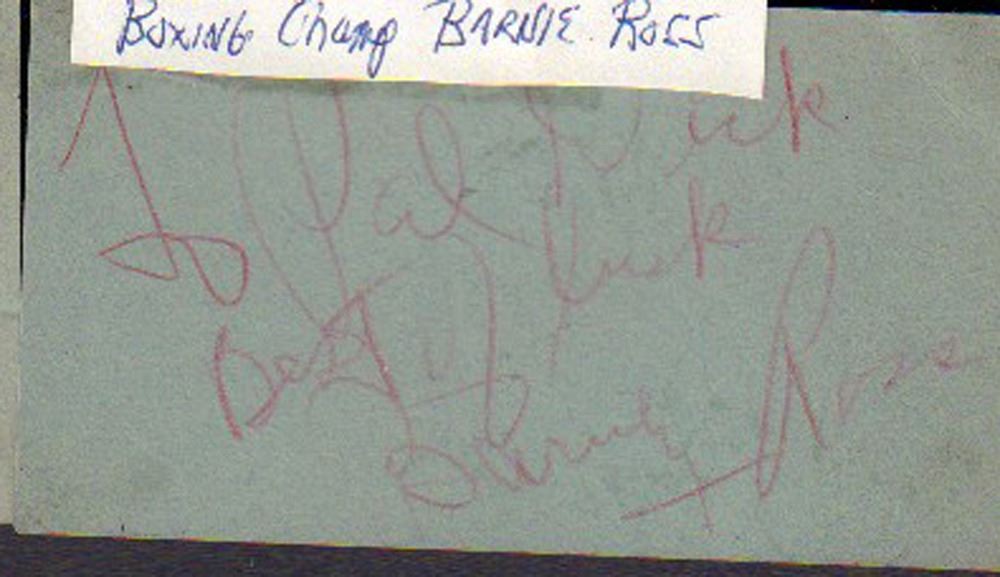 Two inch by four inch rare Ontra Cafeteria parking stub signed by boxing champ Barnie Ross. The Ontra Cafeteria was one of the hot spots of Beverly Hills in the 1950s. All items come with a certificate of authenticity good for the life of the piece.
