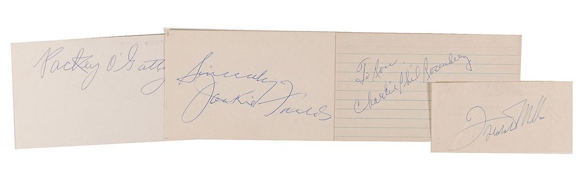Ballpoint signatures of Packey O’Gatty, Jackie Fields, and Charlie ‘Phil’ Rosenberg (ins), on individual off-white 5 x 3 cards (one lined); and a ballpoint signature, “Freddie Mills,” on an off-white 4 x 2 slip. In fine condition, with a diagonal crease to Mills’s slip and a bit of light soiling to cards.