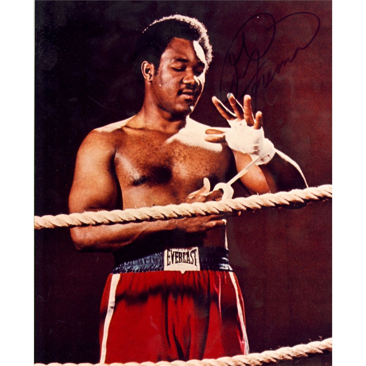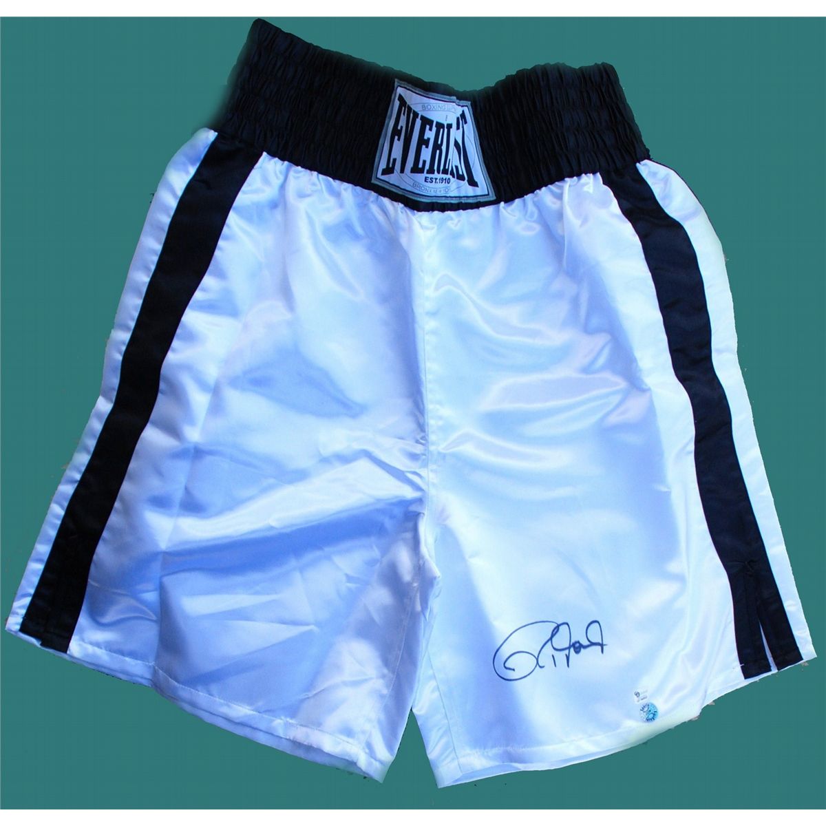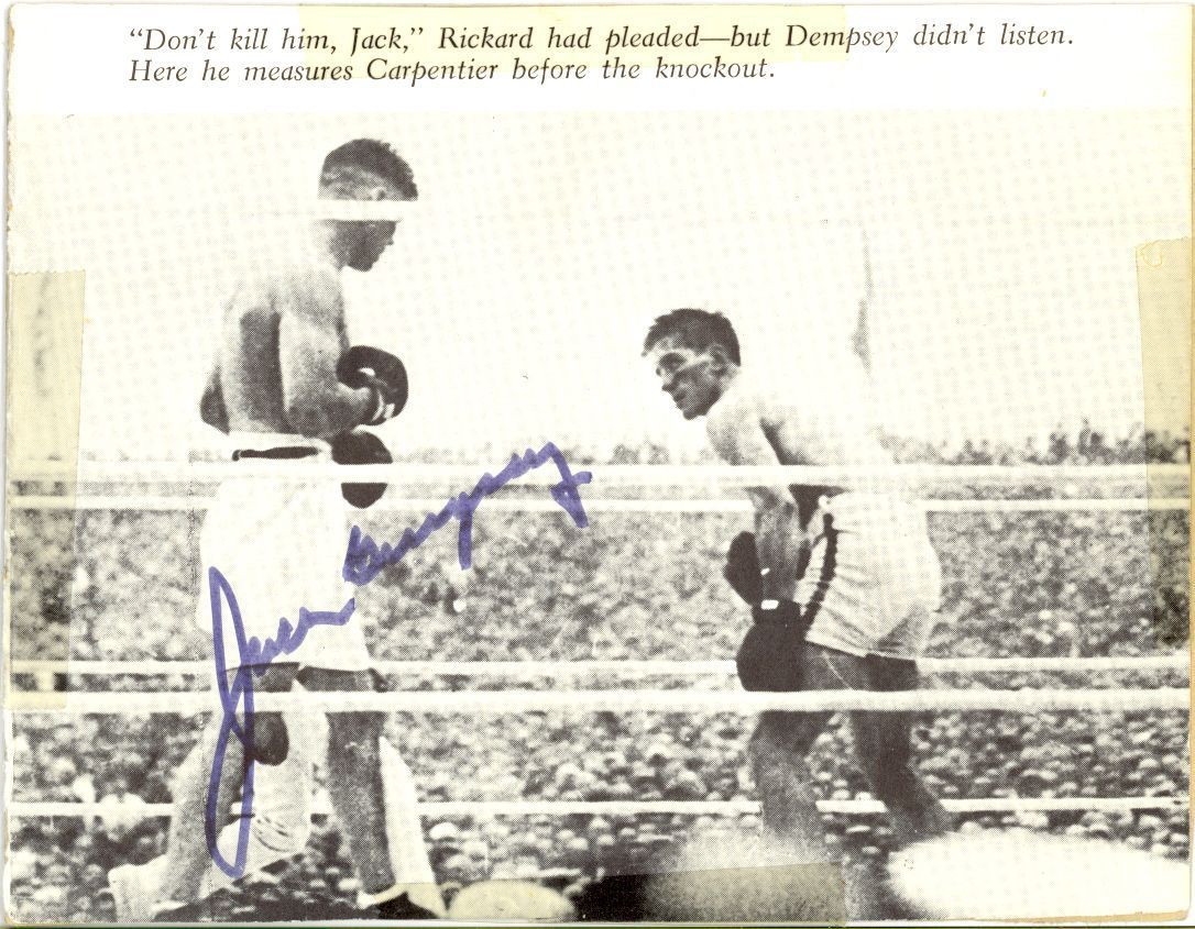 4 signed boxing items.1) Jack Dempsey, 5.5 x 4.25 magazine photo of Dempsey getting ready to knock out Carpentier, signed in blue felt tip. In fine condition, with small areas of tape to each edge and photo affixed to an identical size piece of cardboard.2) Roy Jones White satin Everlast boxing trunks signed on the front in felt tip. In very fine condition, with two authentication labels affixed to trunks.3)George Foreman signed 8 x 10 photo of the retired American professional boxer, two-time World Heavyweight Champion, and Olympic gold medalist.4)Sugar Ray Leonard signed 8 x 10 of the retired professional American boxer. Leonard was the first boxer to earn more than $100 million in purses, won world titles in five weight divisions, and defeated future fellow International Boxing Hall of Fame inductees Wilfred Benítez, Thomas Hearns, Roberto Durán, and Marvin Hagler. Leonard was named "Boxer of the Decade" for the 1980s.All in find condition