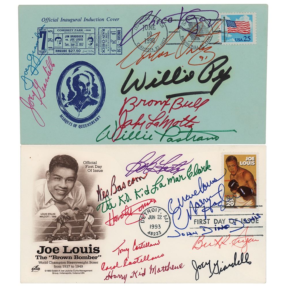 Two commemorative covers, both approximately 6.5 x 35, signed by 16 notable boxers and boxing judges, including: Marvelous Marvin Hagler, Jake LaMotta, Willie Pep, Bob Foster, Carlos Ortiz, Chico Vejar, Wes Bascom, Joey Giardello (2), John Dino Denis, LaMar Clark, Joey Giambra, and more. In overall fine condition.