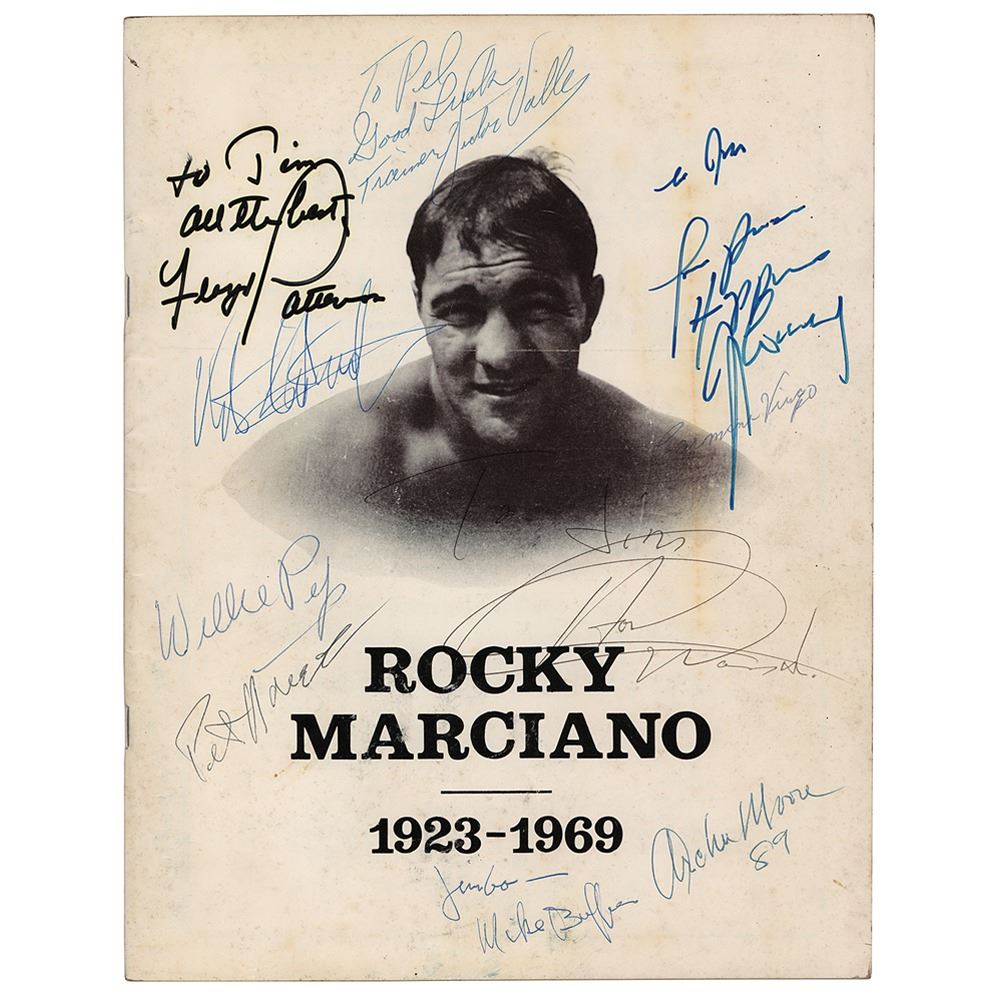 Program for ‘The First Annual Rocky Marciano Scholarship Foundation Dinner,’ held in Springfield, Massachusetts, on January 13, 1989, 8.5 x 11, signed and inscribed on the front cover in ballpoint and felt tip by 11 former greats of boxing, including: Willie Pep, Archie Moore, Floyd Patterson, Vito Antuofermo, Gerry Cooney, Carmine Vingo, Victor Valle and more. The cover is also signed by ring announcer Michael Buffer. In very good to fine condition, with light scuffing to the front cover, and dampstaining to the back cover.