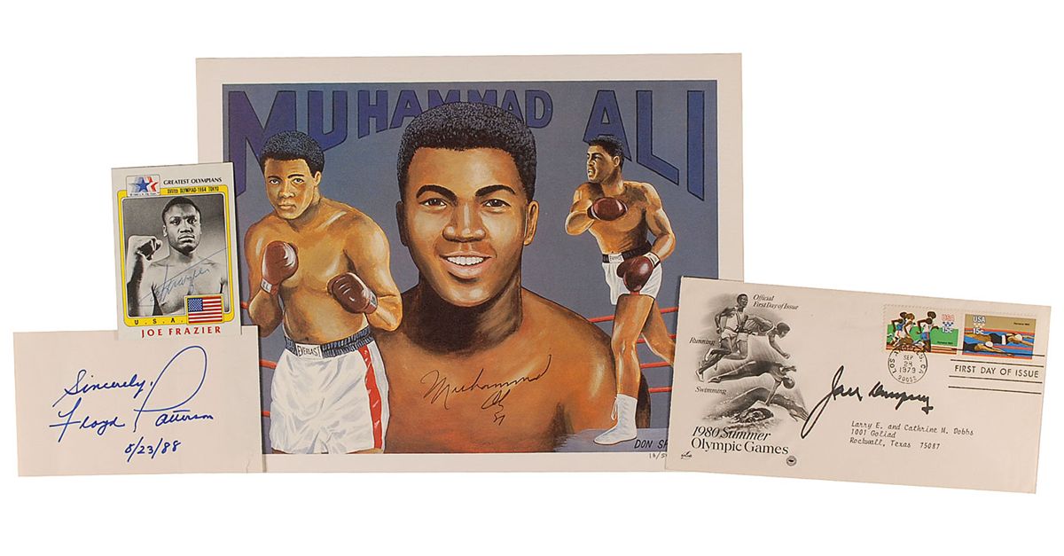 Four items: limited edition color 11 x 8.5 composite print of Muhammad Ali, signed in black ink, “Muhammad Ali 87”; an FDC with a cachet honoring the 1980 Summer Games, signed in black felt tip by “Jack Dempsey”; a felt tip signature, “Sincerely, Floyd Patterson, 8/23/88”; and a 1980 Greatest Olympians trading card of Joe Frazier, signed on the front in blue ballpoint. In fine condition.