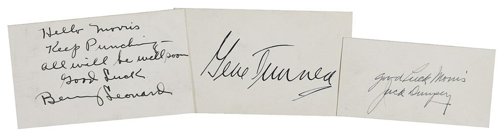 Vintage ink signatures of Gene Tunney and Jack Dempsey (inscribing to Morris), and an ink signature and inscription of Benny Leonard, on individual various-size off-white cards. In fine condition, with a bit of scattered light soiling.
