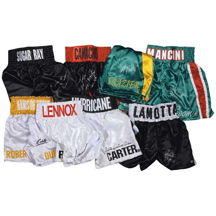 Eight pairs of boxing trunks, each signed in felt tip by a different boxing great. Signers are: Sugar Ray Leonard, Joe Frazier, Ray ‘Boom Boom’ Mancini, Lennox Lewis, Hector ‘Macho’ Camacho, Roberto Duran, Jake LaMotta, and Ruben ‘Hurricane’ Carter. Each is accompanied by a photo taken at time of private signing. In fine condition. RRAuction COA.