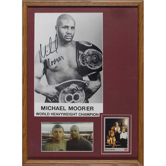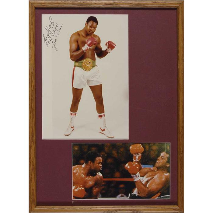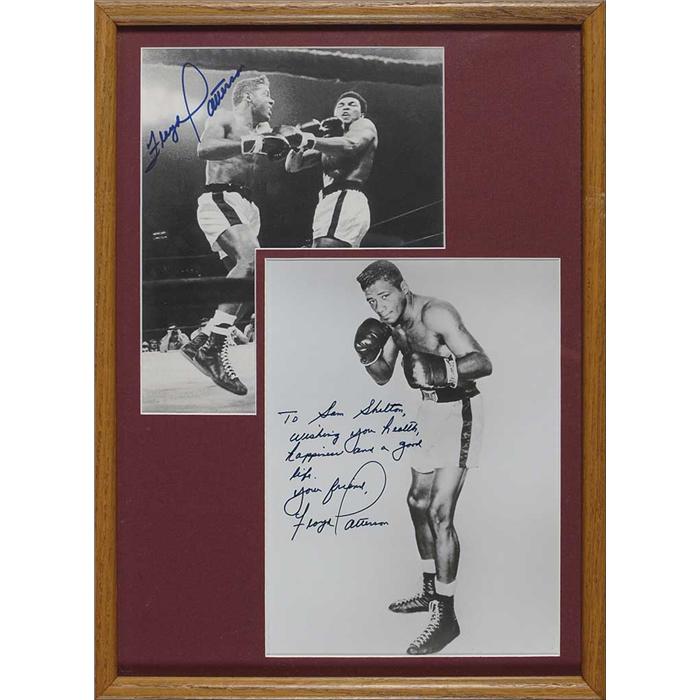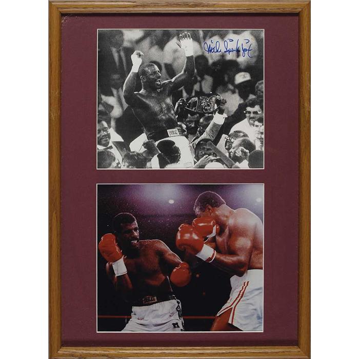 Nine signed photos, various sizes and finishes, each signed in ink or felt tip by the respective heavyweight pictured. Signers are: Buster Douglas (2), Joe Frazier, Larry Holmes, Michael Moorer, Floyd Patterson (2, 1 ins), Leon Spinks (ins), and Michael Spinks. Each fighter’s photo(s), are matted and framed, some with unsigned photos, to overall sizes of 12.5 x 17. In fine condition. RRAuction COA.