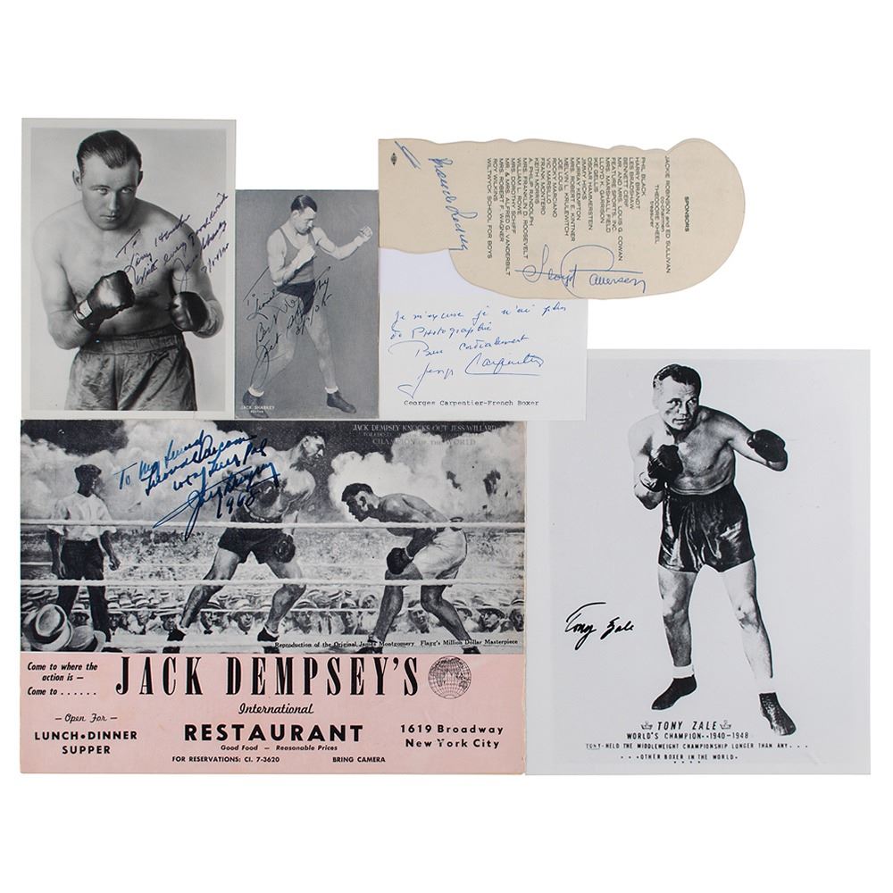 Group of six items signed by boxers, including: Jack Dempsey (inscribed menu), Floyd Patterson and Branch Rickey (testimonial dinner invitation), Jack Sharkey (postcard and SP, both inscribed), Tony Zale (SP), and Georges Carpentier (signature). In overall fine condition.