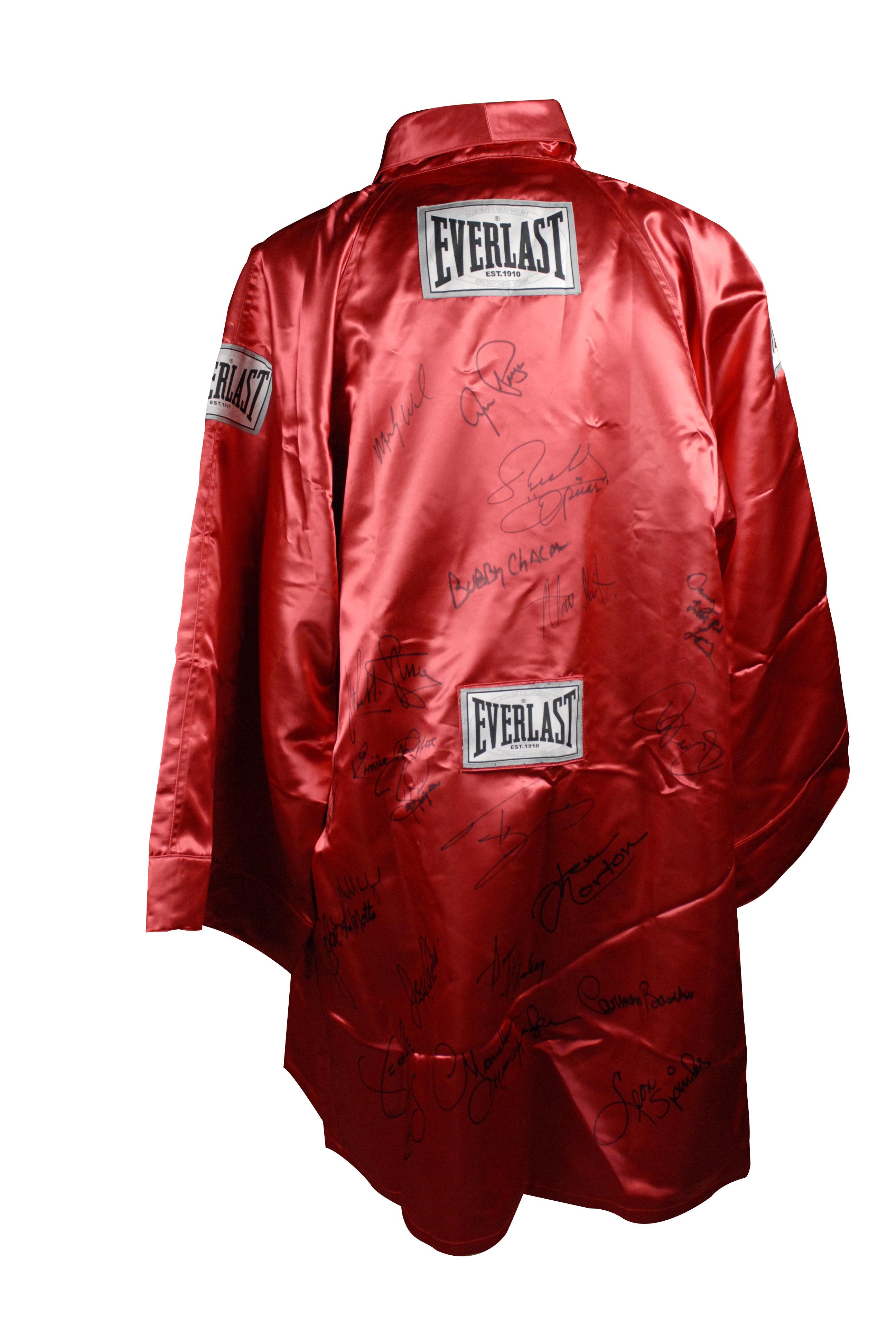 Everlast red silk boxing robe signed in black felt tip on the back by 22 boxing greats, including: Marvelous Marvin Hagler, Leon Spinks, Ken Norton, Jake LaMotta, Jose Torres, Sugar Shane Mosley, Emile Griffith, Bobby Chacon, Danny ‘Little Red’ Lopez, Carmen Basilio, Ken Buchanan, Michael Carbajal, George Chuvalo, Diego Corrales, Barry McGuigan, Alan Minter, Terry Norris, Ruben Olivares, Aaron Pryor, Marlon Starling, John H. Stracey, and Mickey Ward. In fine condition. Accompanied by a card-sized, laminated Certificate of Authenticity signed by Executive Director of the International Boxing Hall of Fame Edward Brophy.