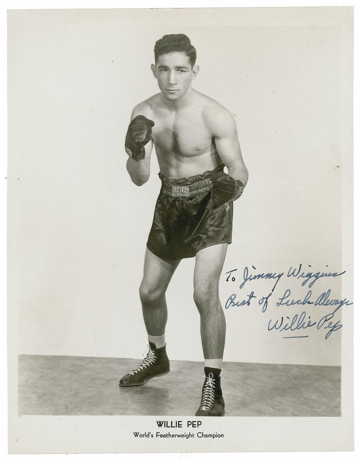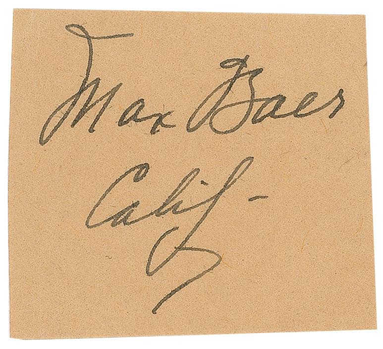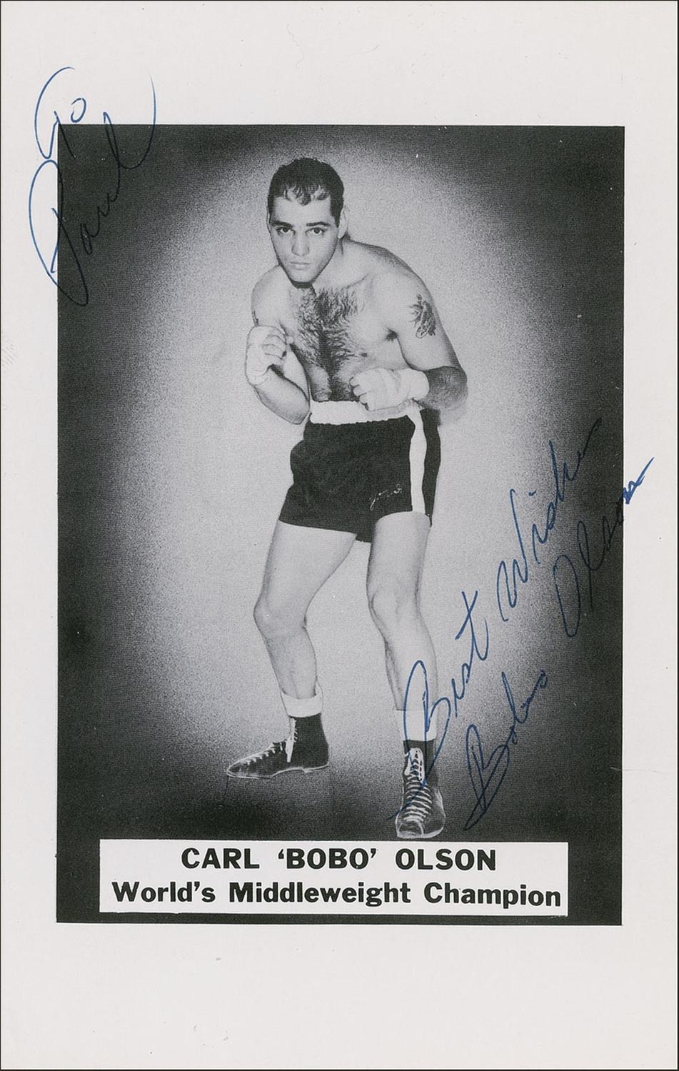 Three items: vintage glossy 8 x 10 full-length photo of Willie Pep taken as world’s featherweight champion, signed and inscribed in fountain pen; an ink signature “Max Baer, Calif.,” on a tan 1.75 x 1.5 slip; and a vintage cardstock 4.5 x 7 photo of Carl ‘Bobo’ Olson when he was world middleweight champion, signed and inscribed in blue ballpoint. In fine overall condition.