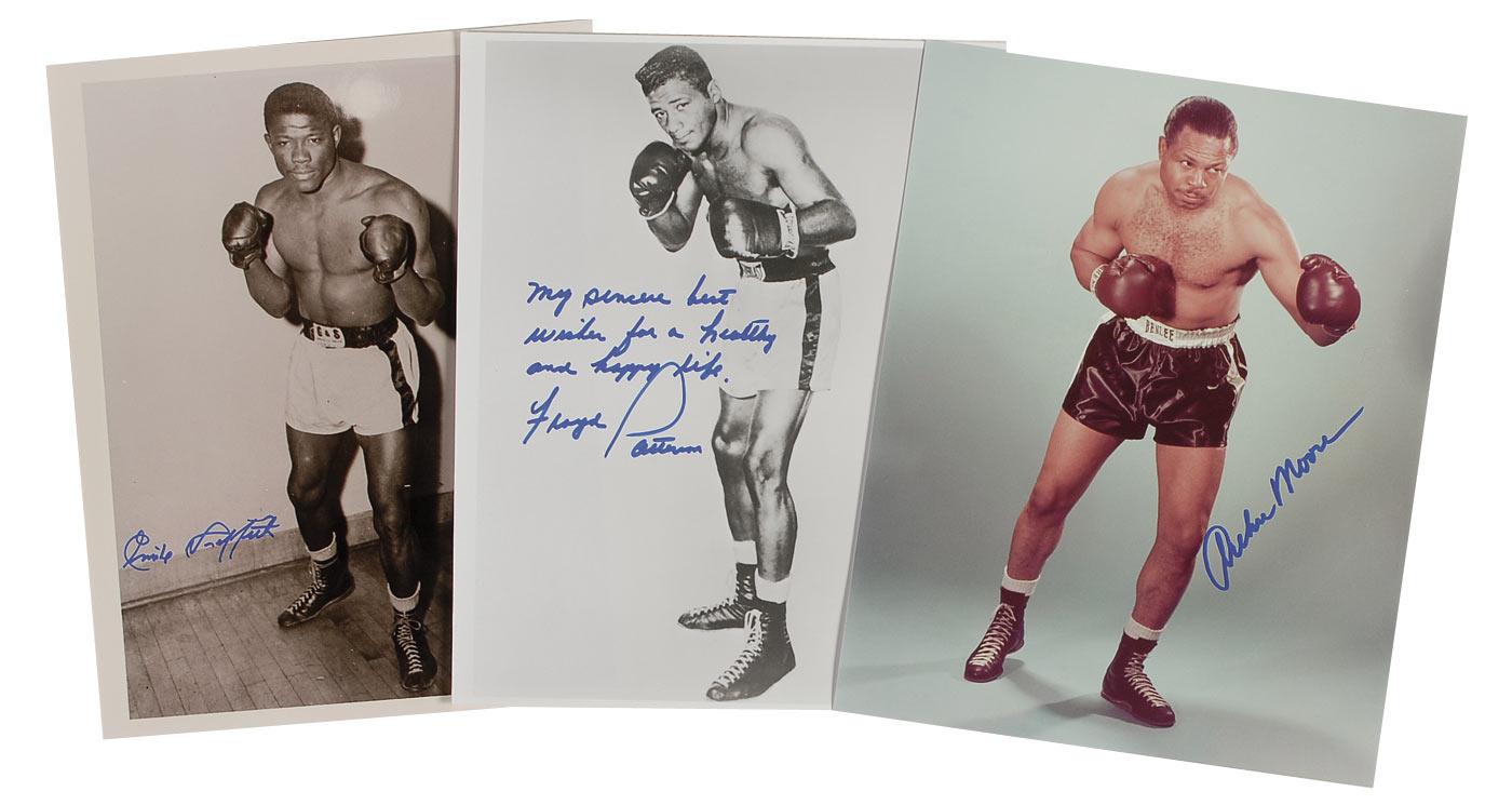 Three glossy 8 x 10 photos, one color, each signed in felt tip by the respective boxer pictured. Signers are: Archie Moore, Emile Griffith, and Floyd Patterson, who adds “My sincere best wishes for a healthy and happy life.” In fine condition.