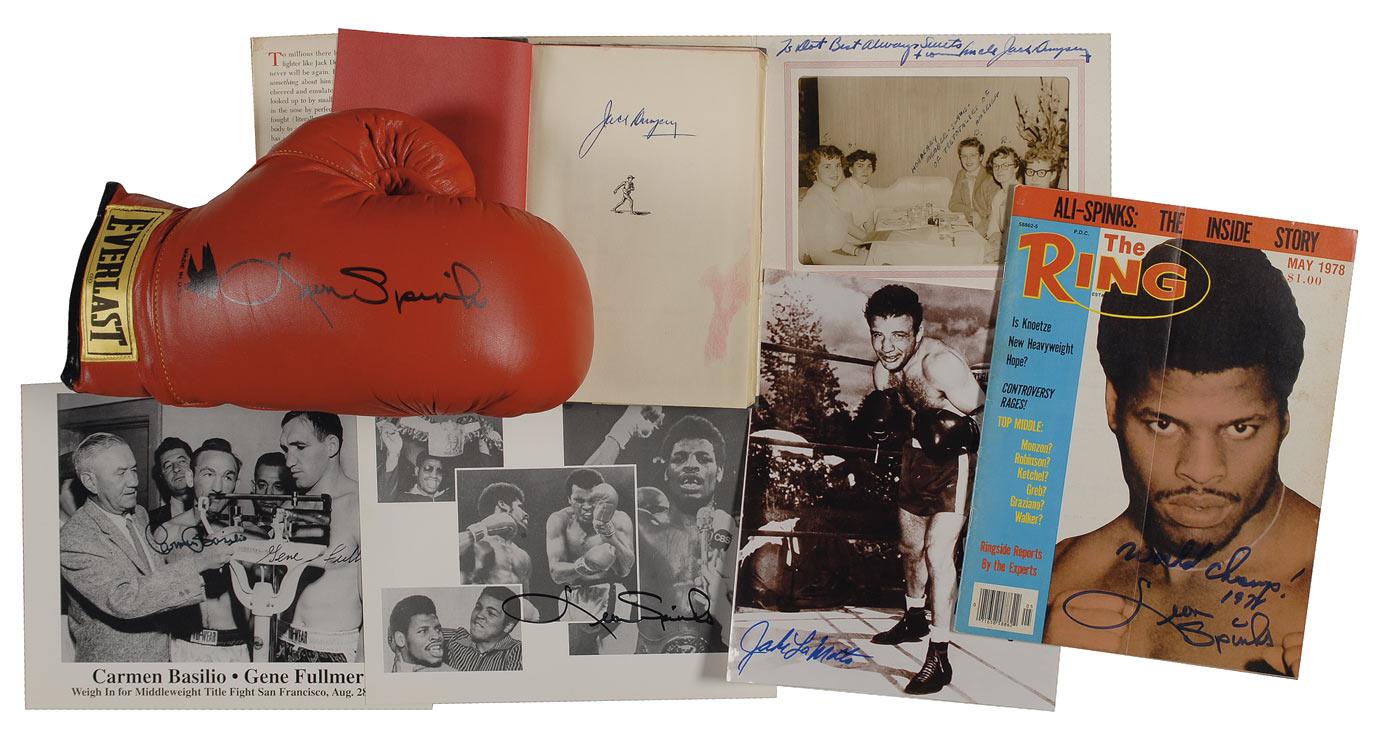 Seven items: three photos, one glossy 8 x 10 of Jake LaMotta signed in blue felt tip and two cardstock 10 x 8 photos, individually signed in black felt tip by Leon Spinks, and Carmen Basilio and Gene Fullmer; hardcover first printing of Dempsey, signed on the second free end page page in blue ballpoint by Jack Dempsey; a Jack Dempsey’s Broadway Bar and Cocktail Lounge souvenir photo folder, signed above a photo of five women (one being the champ’s niece), “To Dot, Best Always Sweets from Uncle Jack Dempsey”; The Ring magazine (1978) signed on the cover in blue felt tip, “World Champ 1978! Leon Spinks;” and a right-handed Everlast boxing glove signed in black felt tip by Spinks. In overall very good condition to fine condition with mild toning to the cover of the Dempsey folder, mild wear to the book, and a vertical crease passing through the magazine cover.