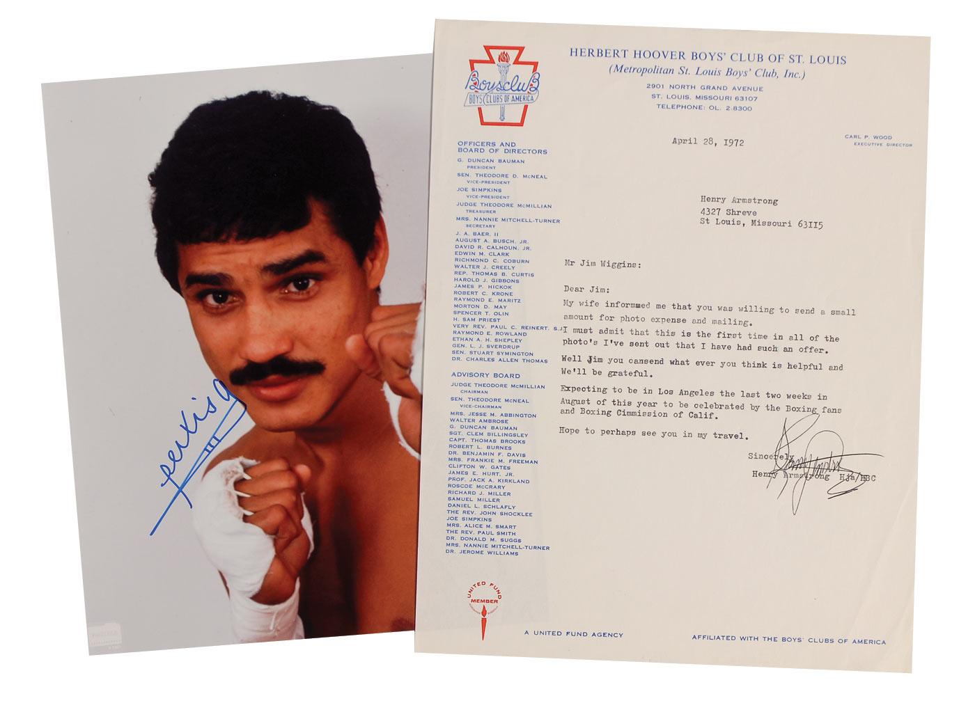 Two items: color glossy 8 x 10 photo signed in blue felt tip by Alexis Arguello; and a 1938 TLS signed by Henry Armstrong. In overall fine condition.