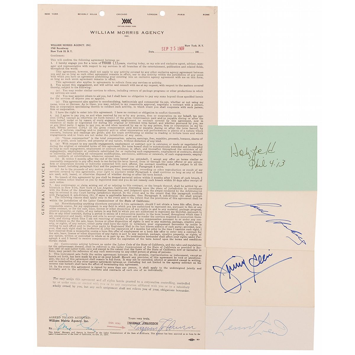 Ink and felt tip signatures of Lennox Lewis, Larry Holmes, [Evander] Holyfield, and Jimmy Ellis on individual off-white and colored 5 x 3 cards; and a DS, signed by Ingemar Johansson, one page, 8.25 x 15.5, September 25, 1959, being a three-year General Services agreement between Johansson and the William Morris Agency. In fine condition, with punch holes to top of document and expected wear.